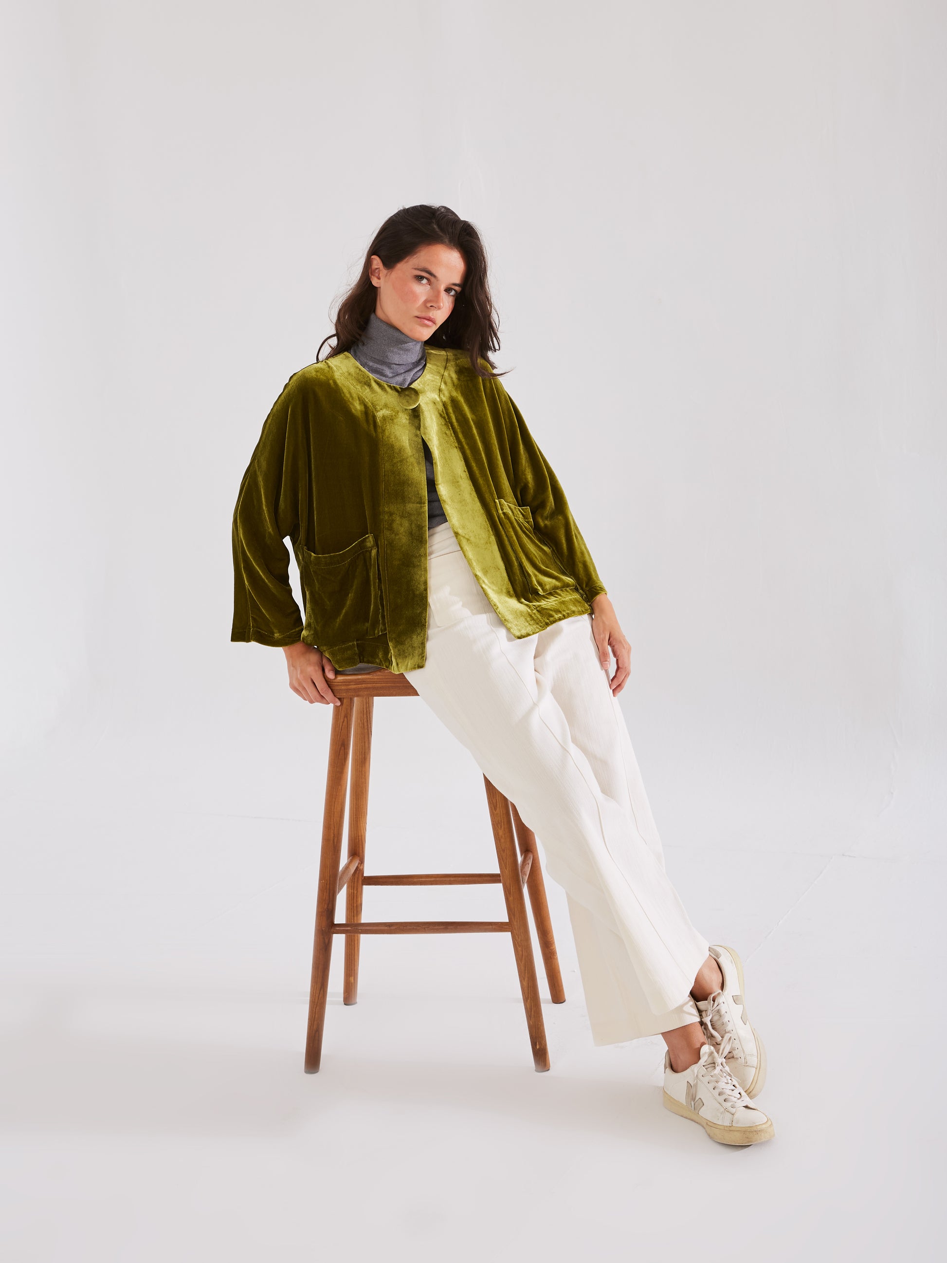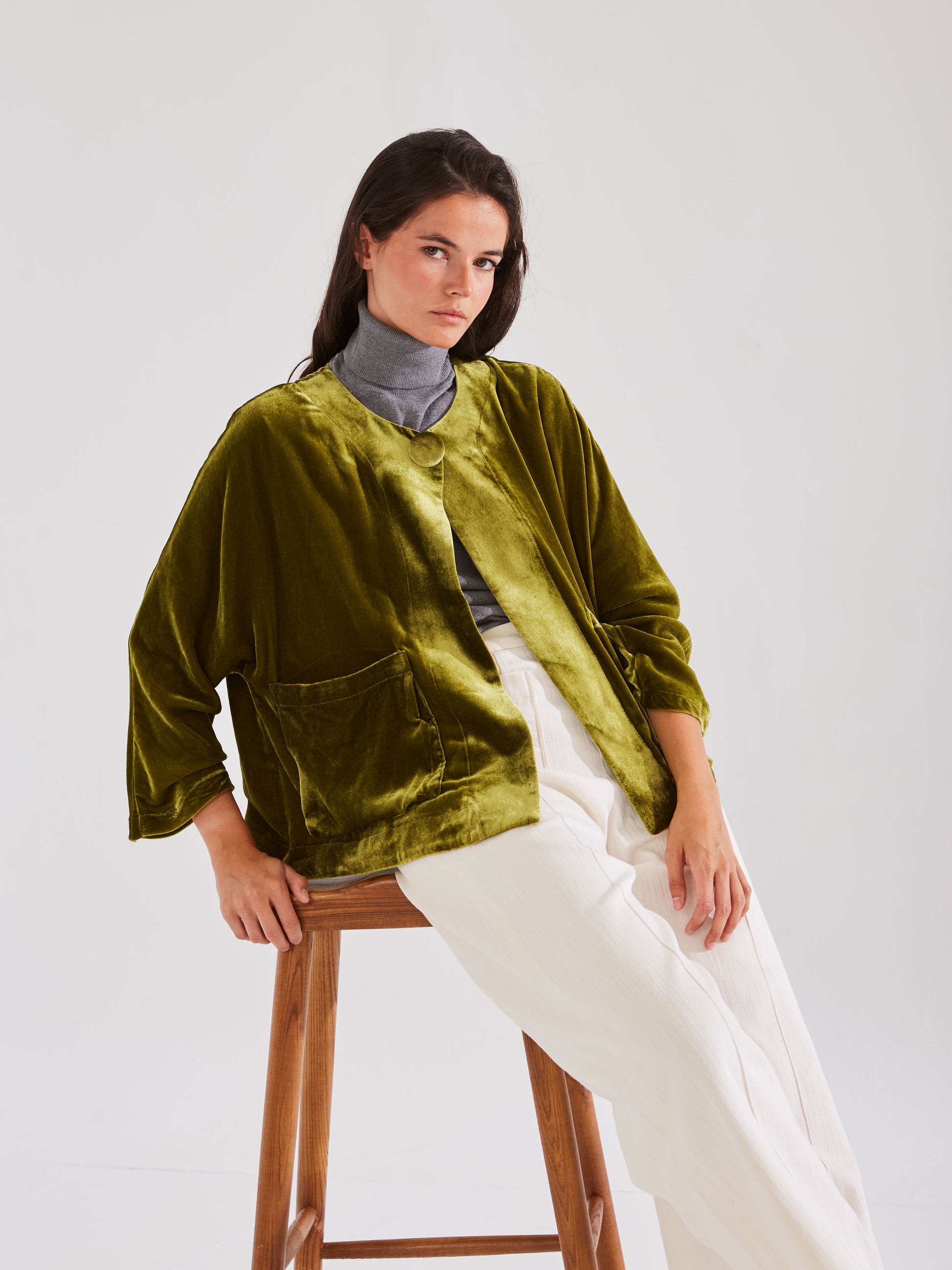Chaqueta cuello caja, con un solo botón en el cuello, grande y forrado de terciopelo, y dos bolsillos plastón.