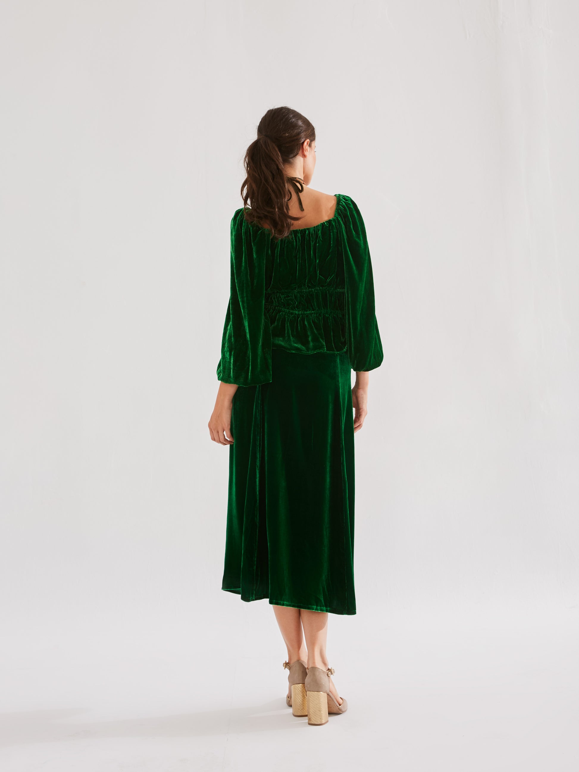 Conjunto de blusa y falda de terciopelo de seda. Camisa de terciopelo de seda, con cuello escotado, mangas abullonadas y cintura marcada. Falda midi de terciopelo de seda.
