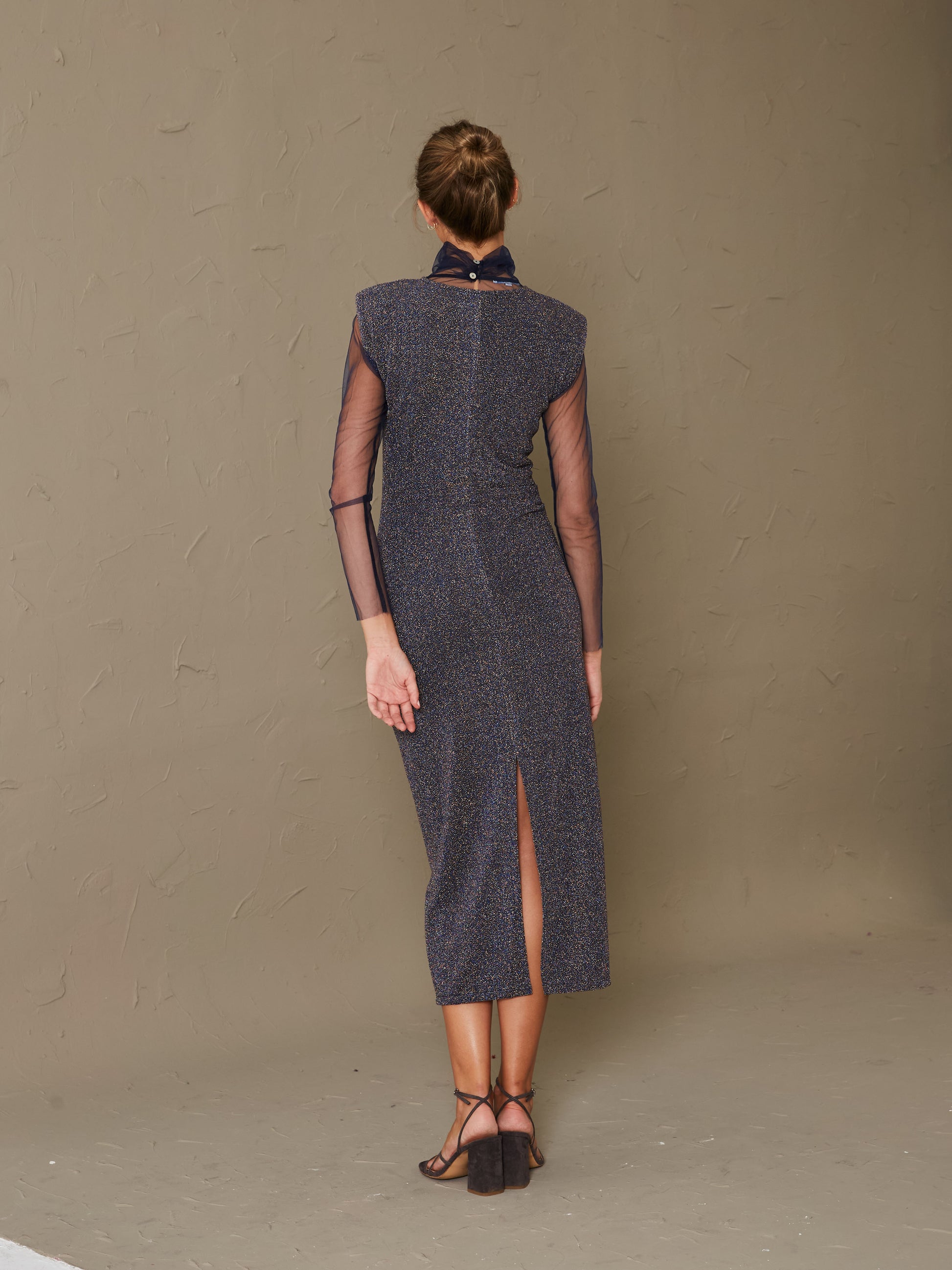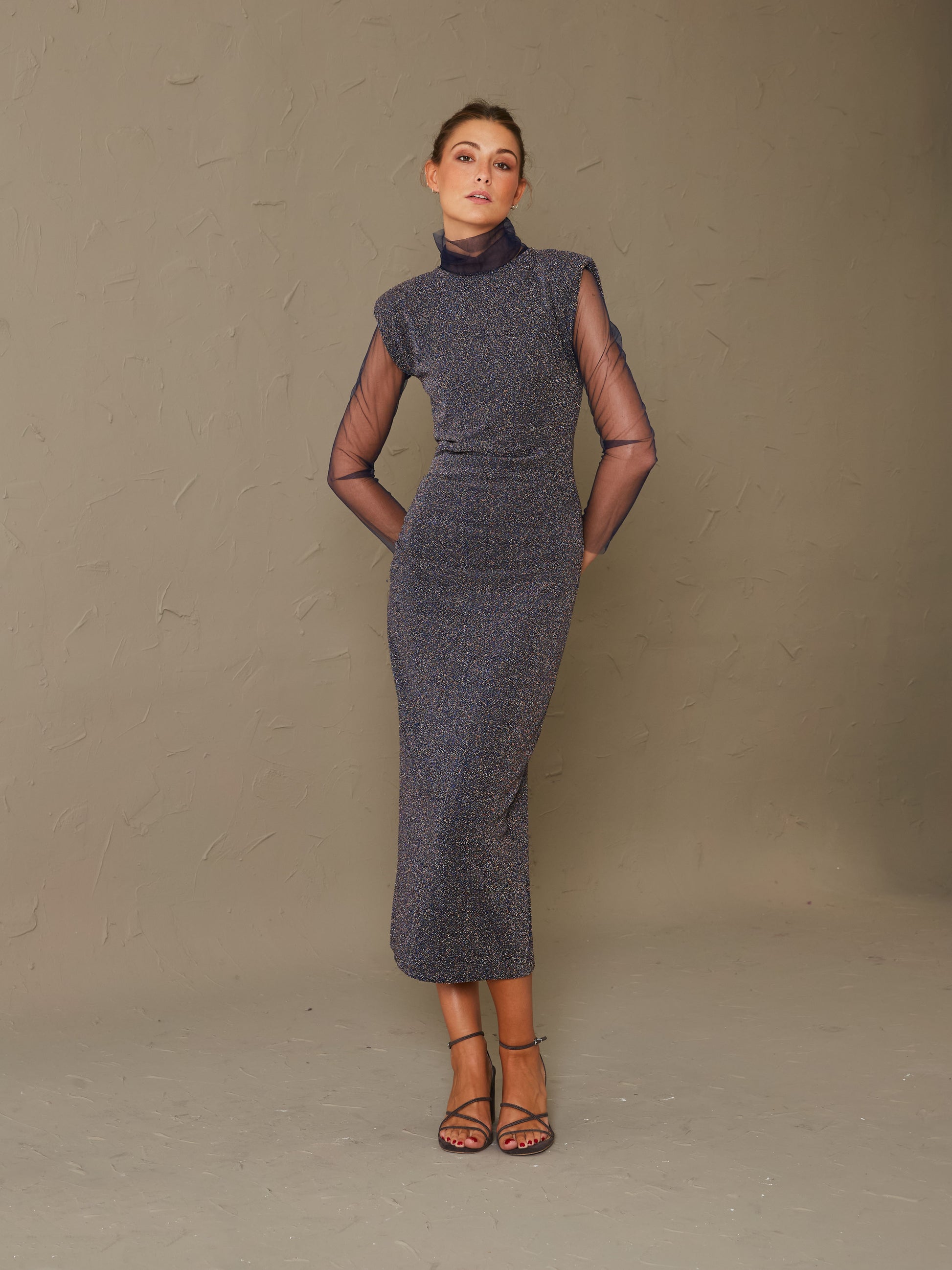 Dos piezas: top cuello alto en tul transparente y vestido sin mangas con cuello caja, entallado y largo midi. Vestido de tejido elástico que se adapta muy bien.