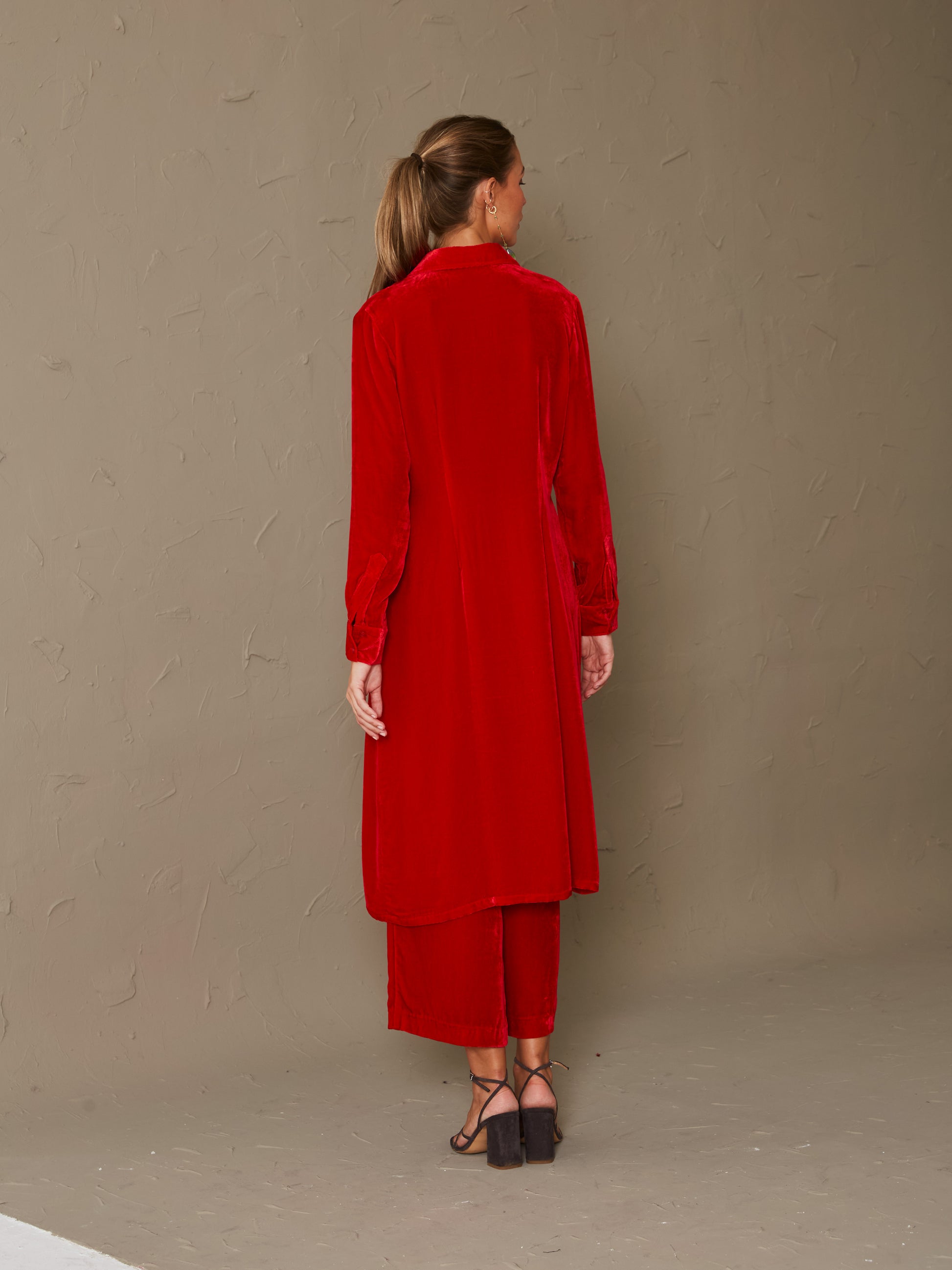 Conjunto de chaqueta y pantalón de terciopelo de seda. Chaqueta con largo midi y cuello camisero. Pantalón con cierre y cremallera frontal.