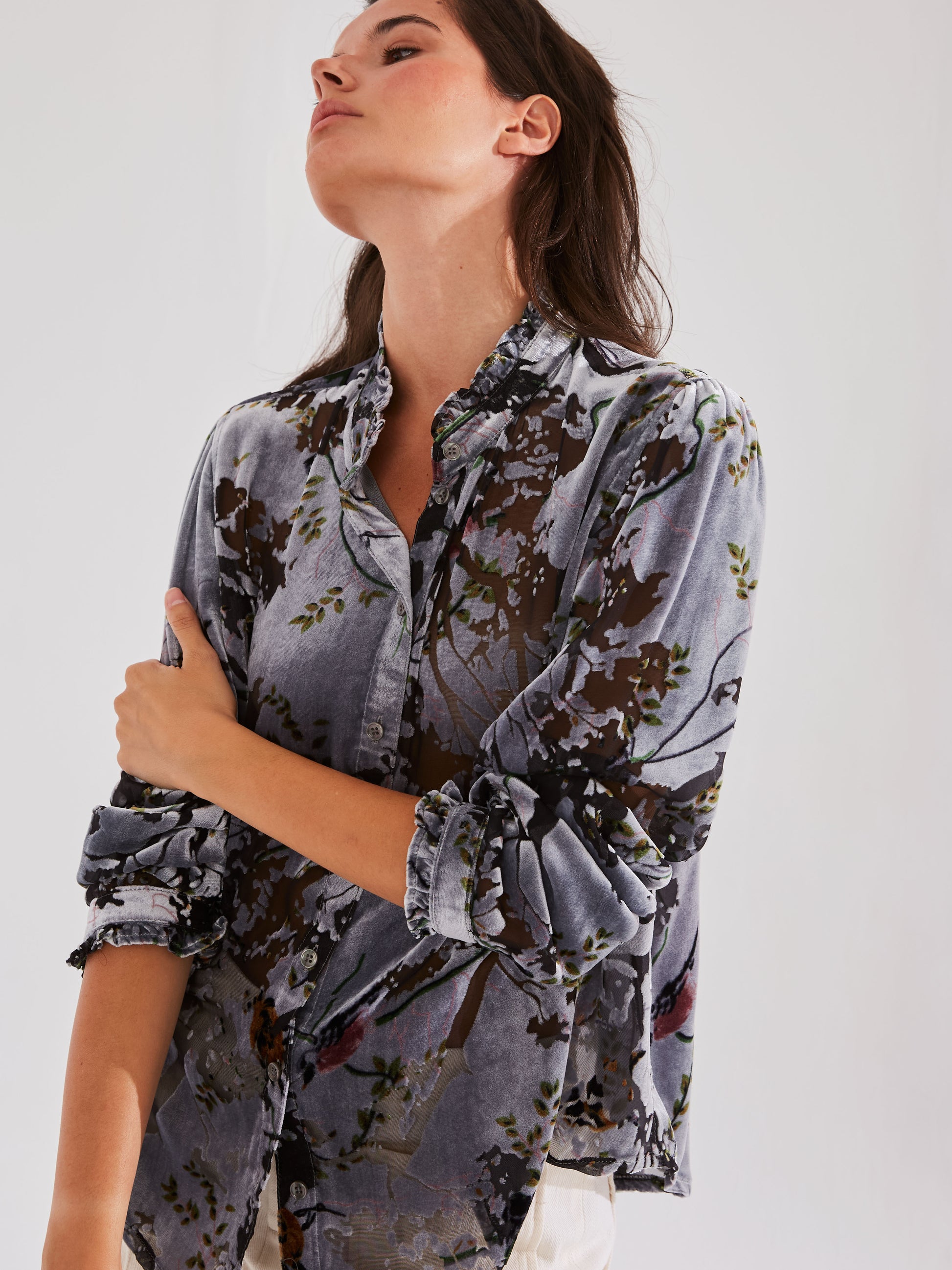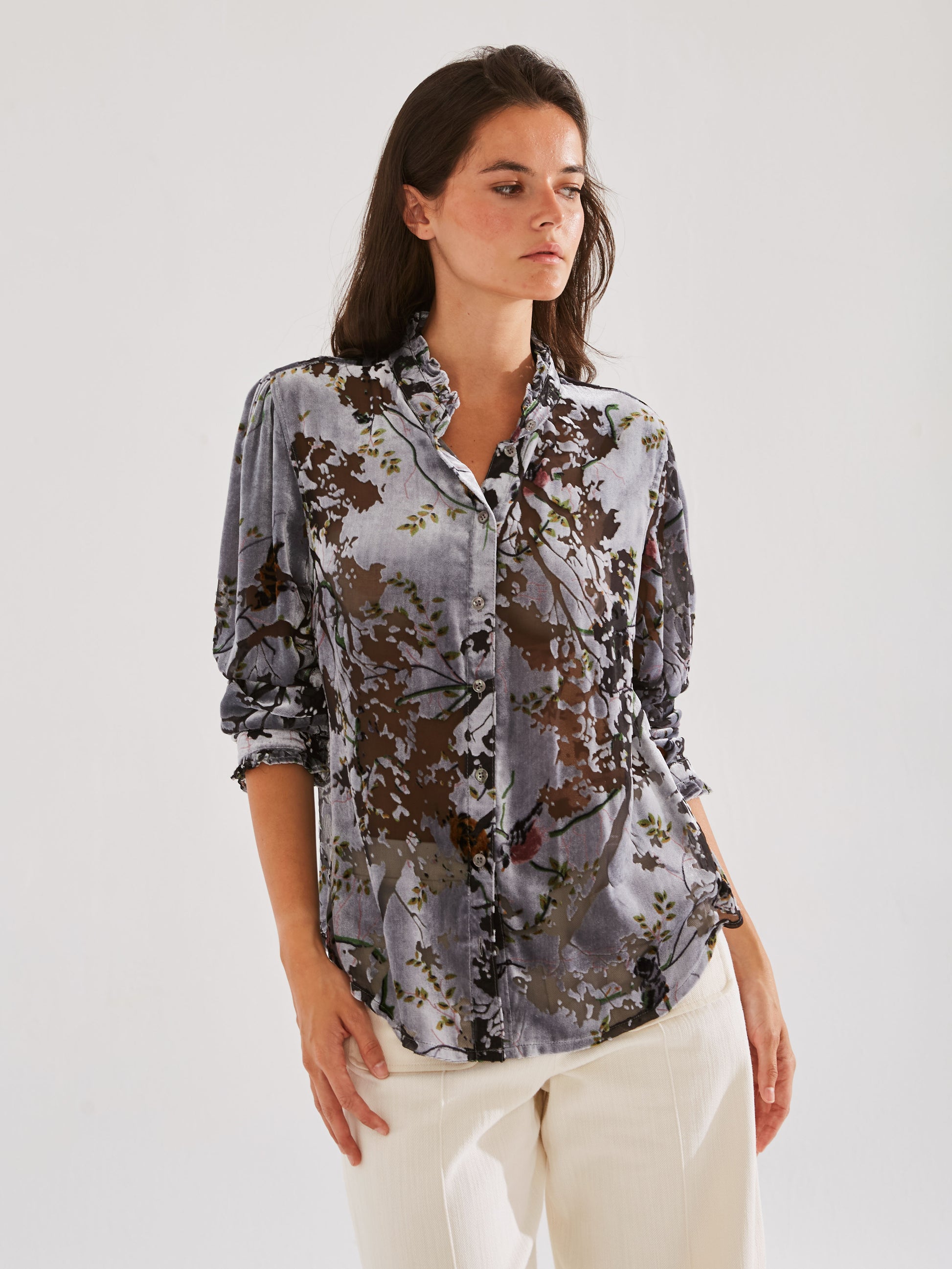 Camisa de terciopelo labrado de seda, con cuello maho y mangas fruncidas.