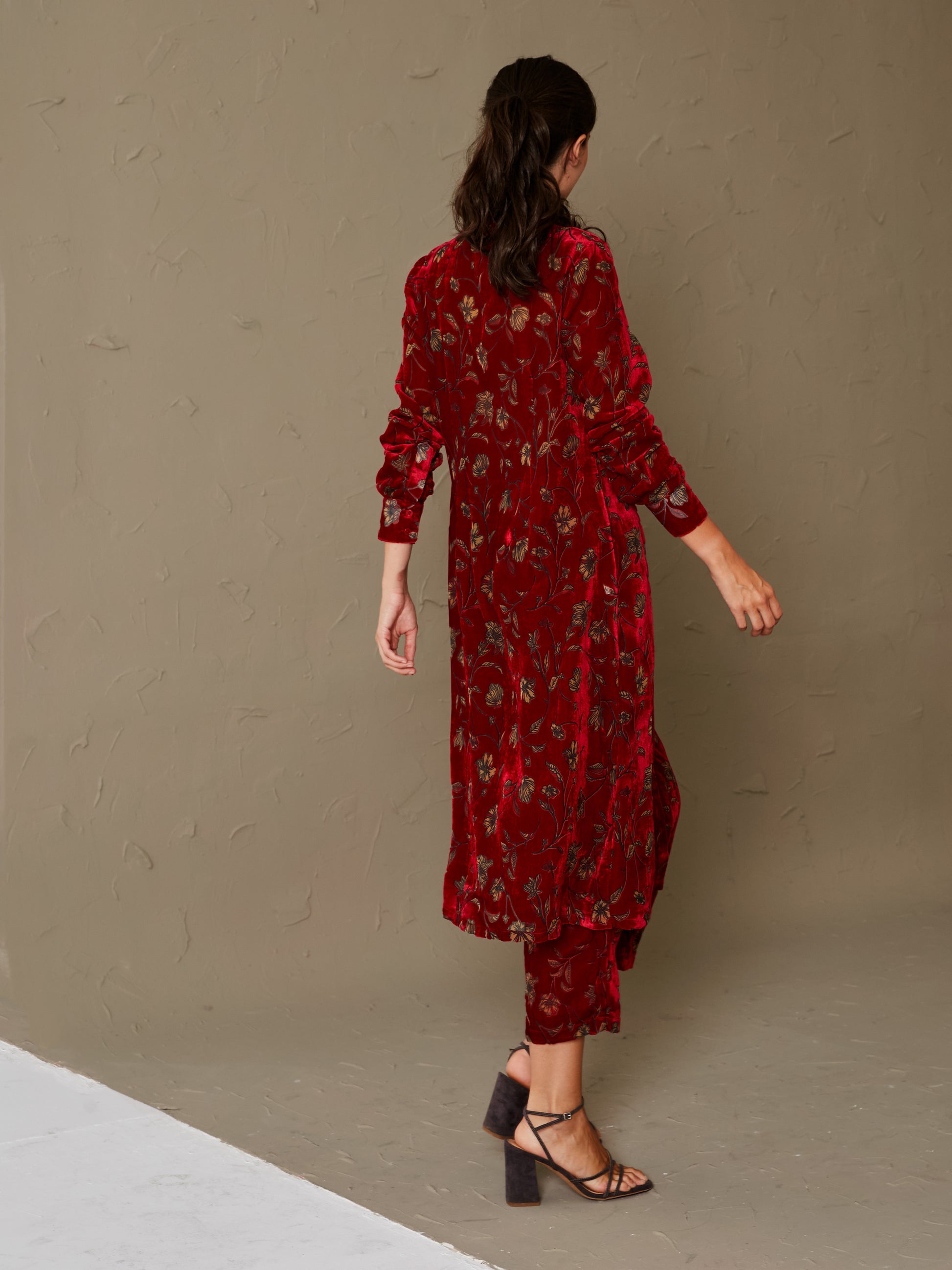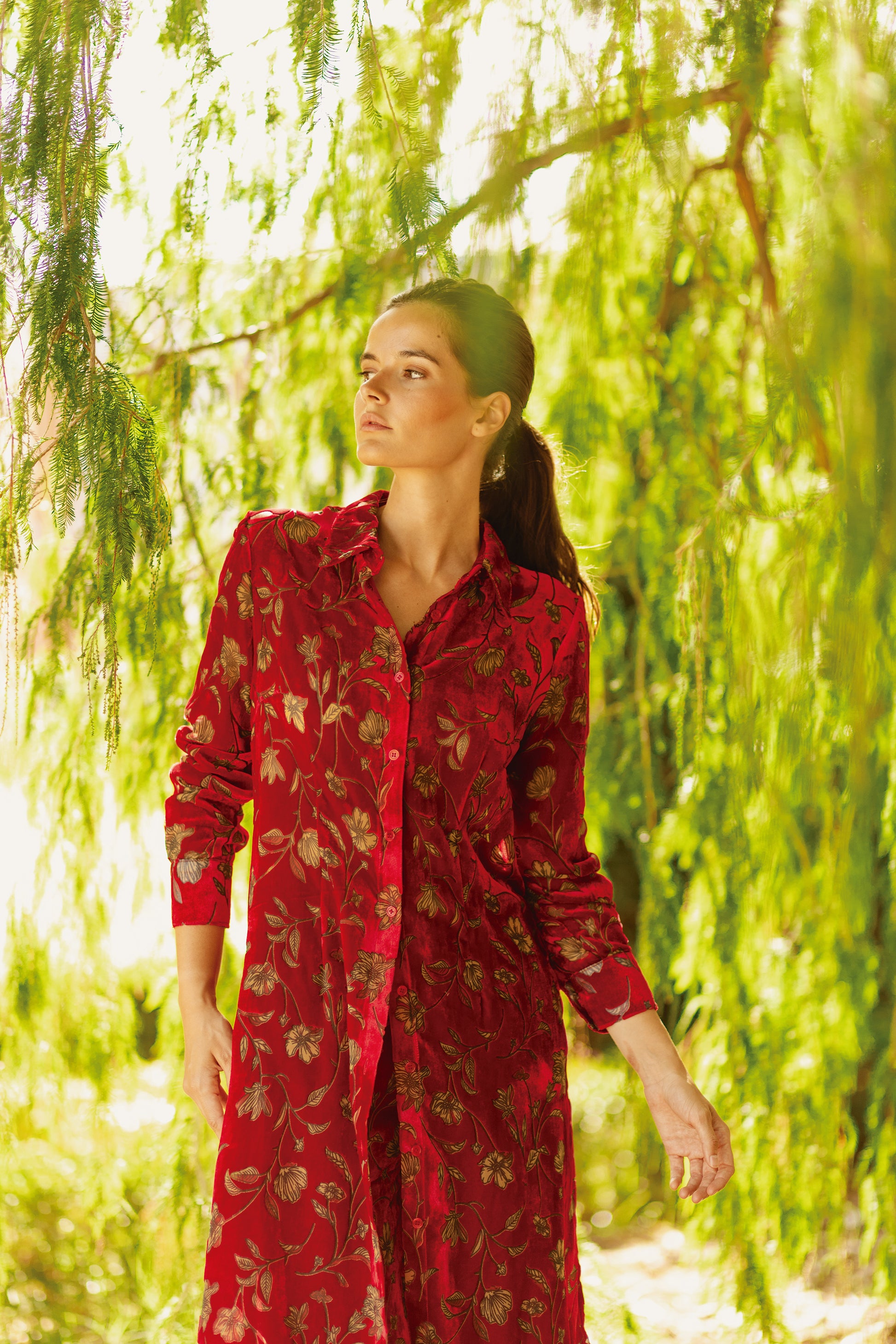 Chaqueta de terciopelo labrado de seda, largo midi, con cuello camisero.