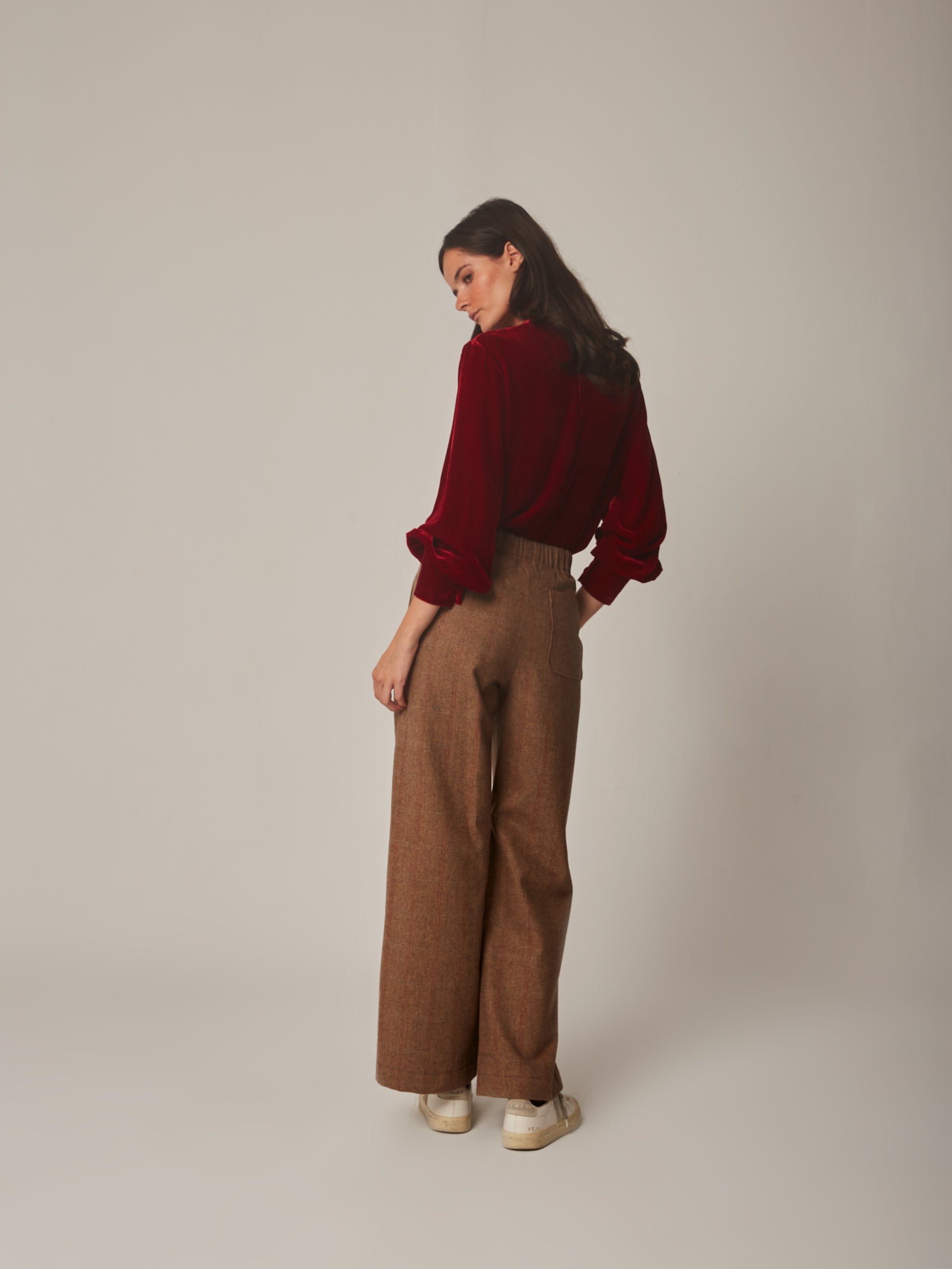 Pantalón ancho de lana cashmere, de cuadros, con cierre y cremallera frontal, con bolsillos laterales y forro interior.