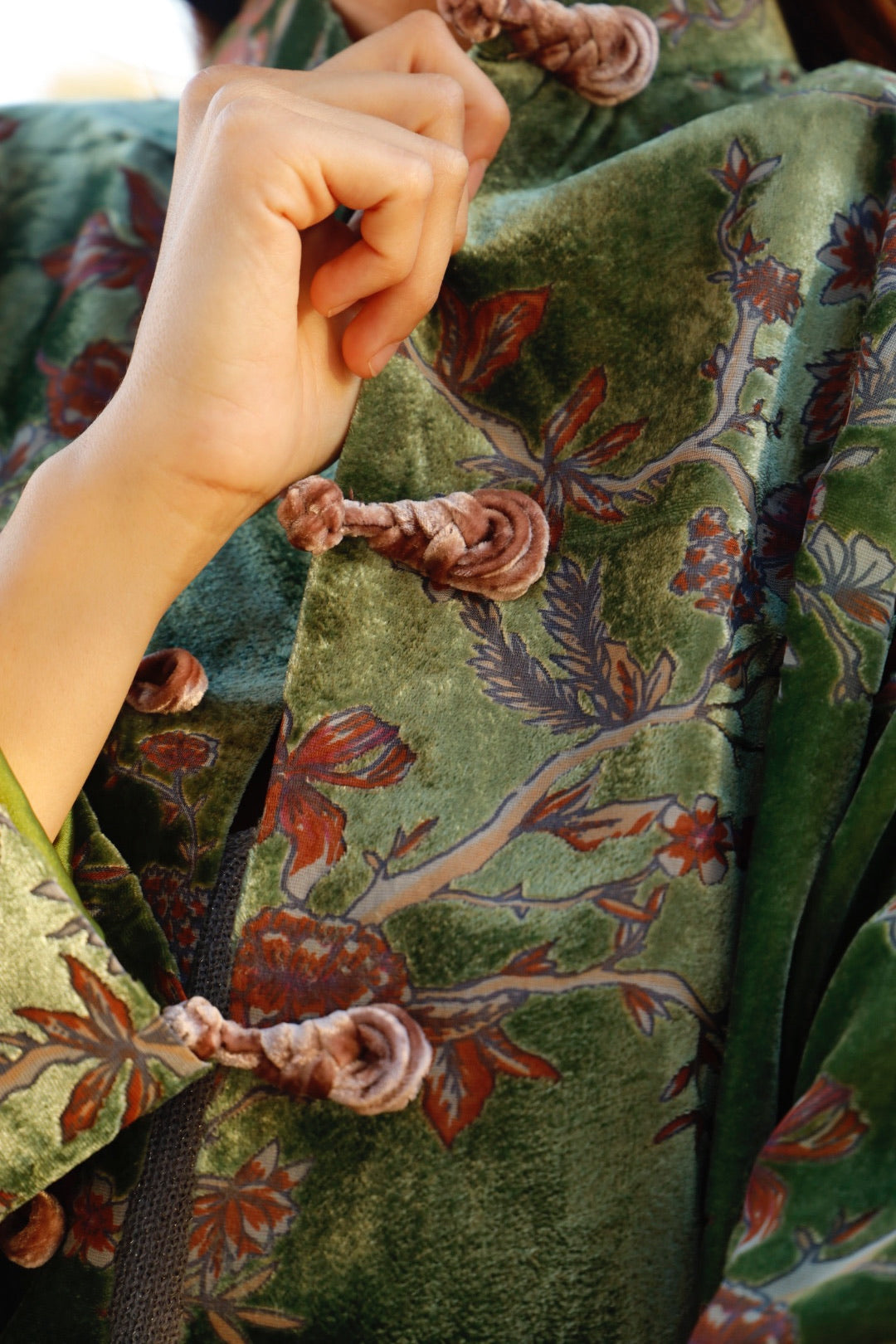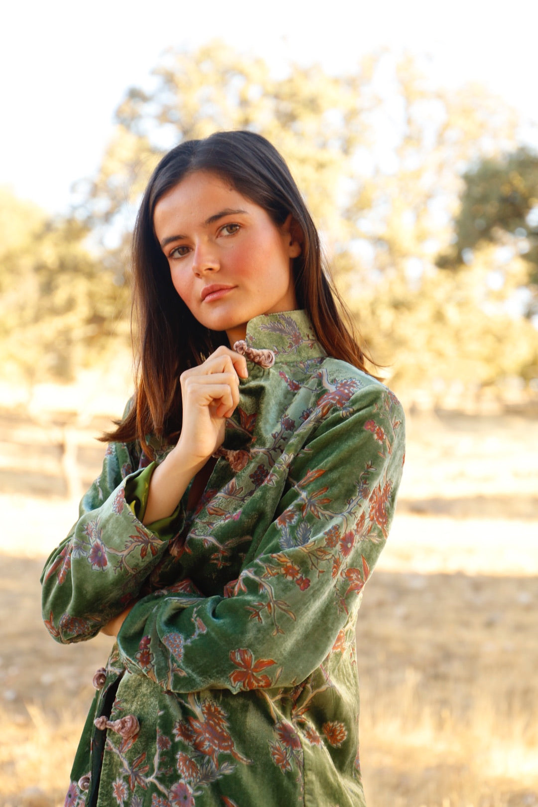 Chaqueta de terciopelo de seda labrado con cuello mao.