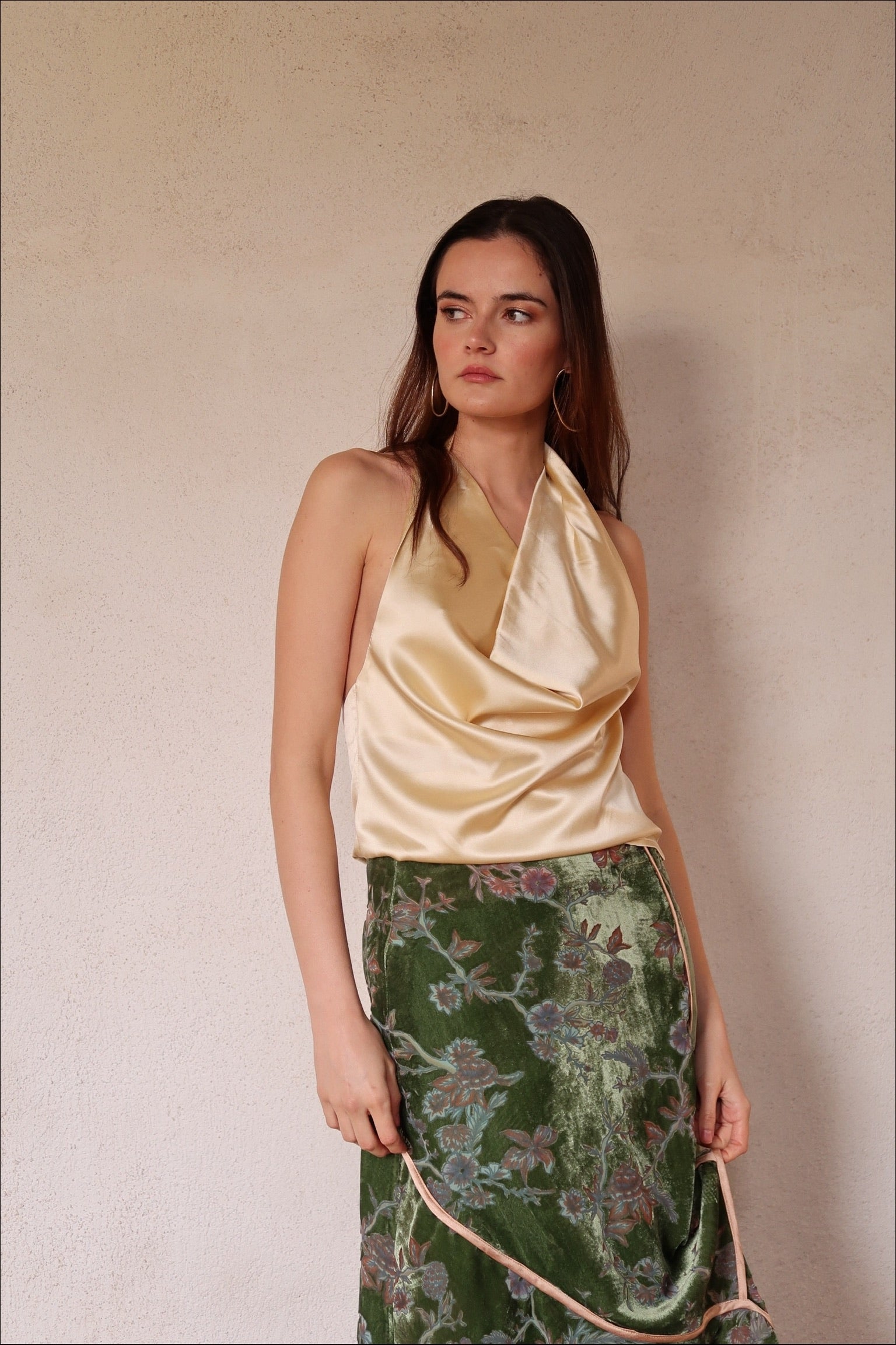 Falda de terciopelo de seda labrado, asimétrica y con volante amplio.