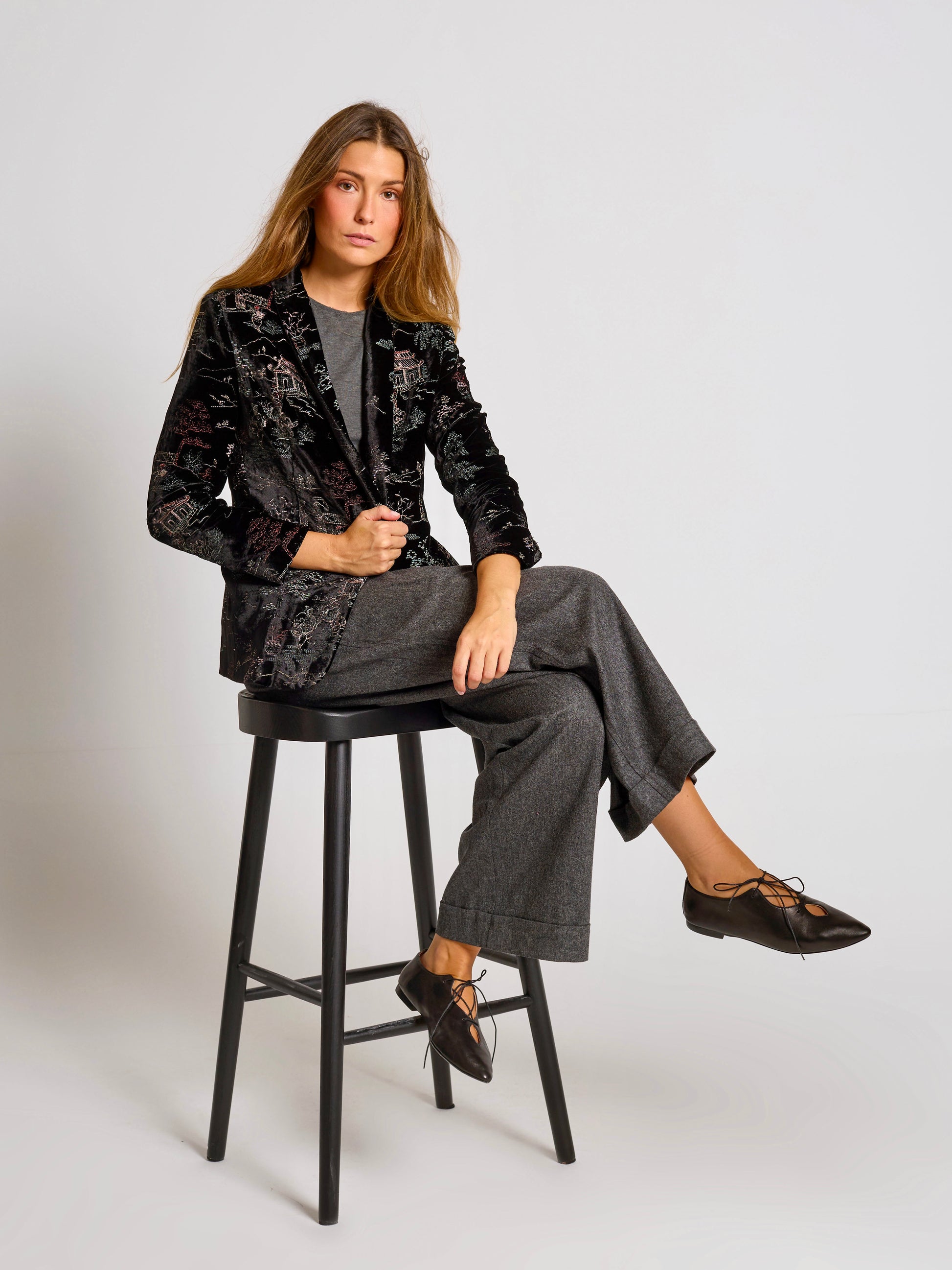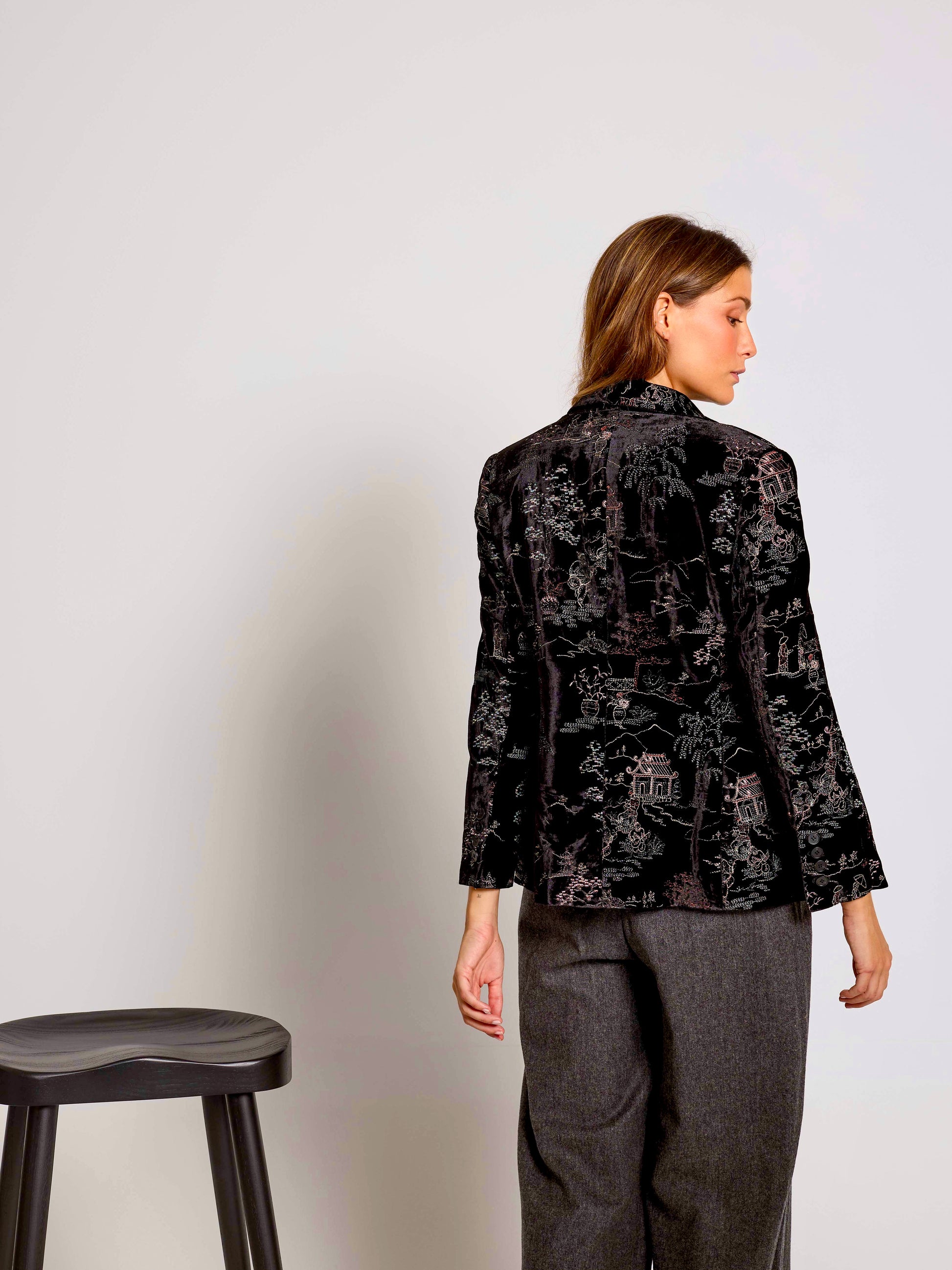 Blazer cuello smoking en terciopelo de seda con minucioso bordado oriental.