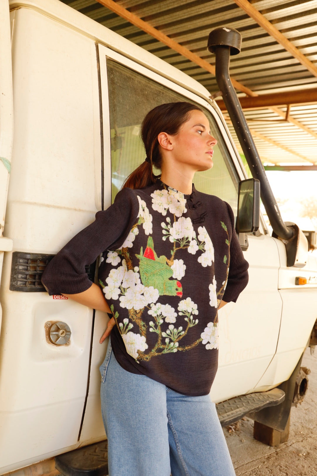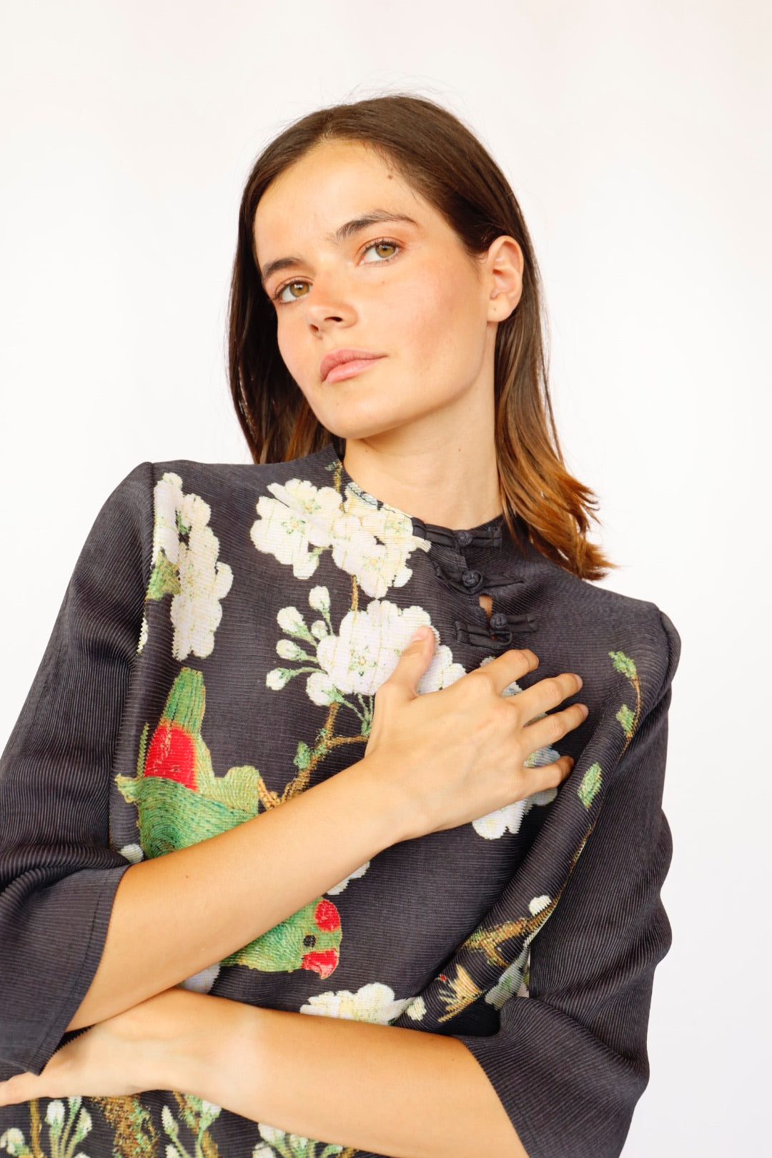 Camisa negra estampado floral de tejido estilo Fortuny, de gran movimiento y con un escote oriental abierto en el cuello.
