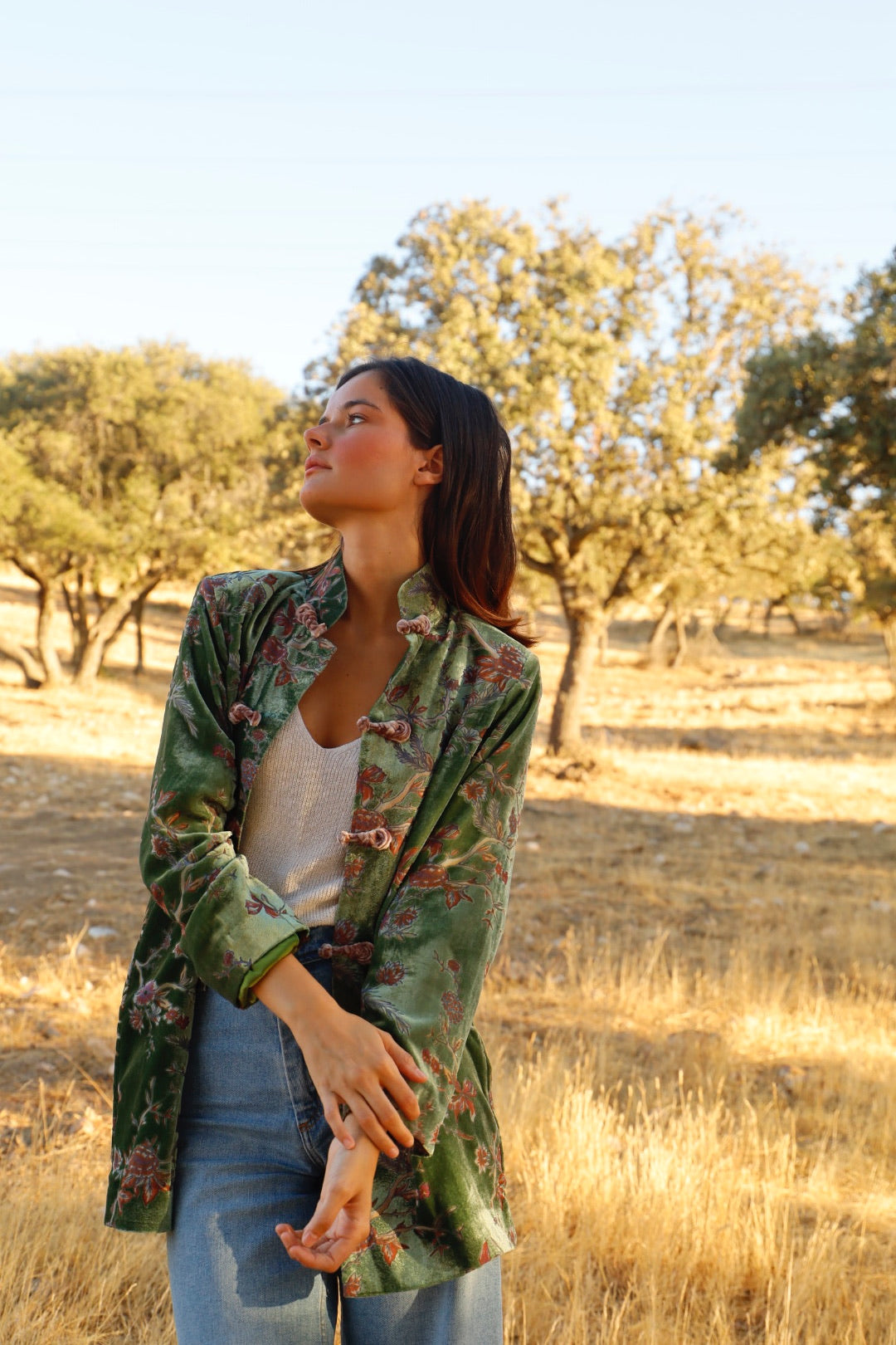 Chaqueta de terciopelo de seda labrado con cuello mao.