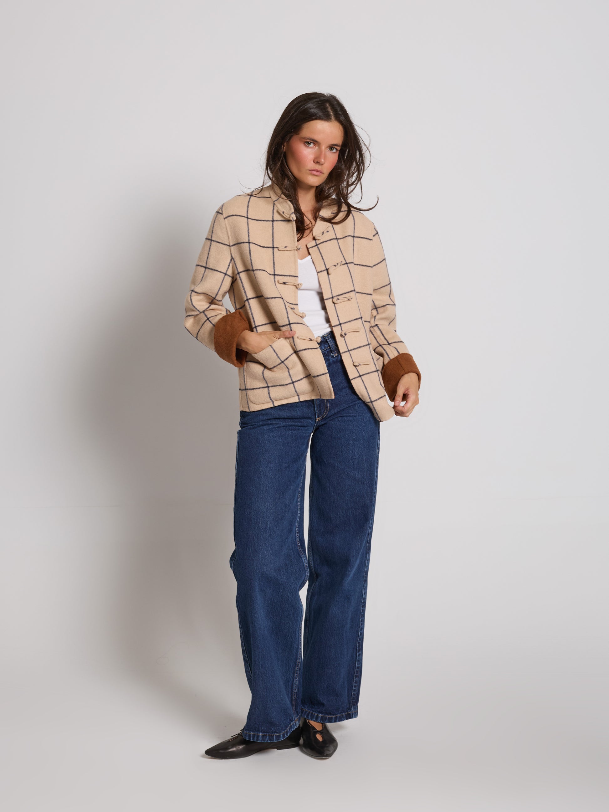 Chaqueta en lana en doble cashmere. Con cierres orientales, cuello maho y bolsillos tipo plastón . Exterior en cuadros e interior en camel liso.