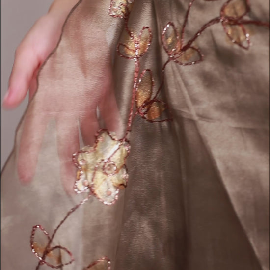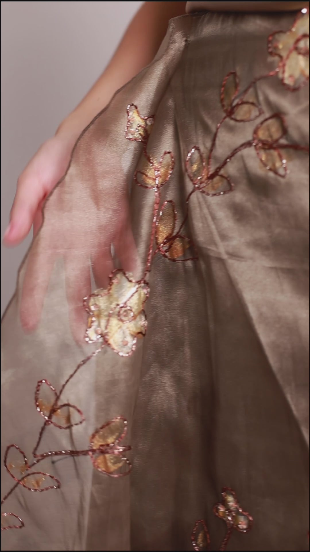 Composición: Blusa en seda natural 100%. Falda interior en crepe elástico y falda exterior en chifón crepé bordado.
