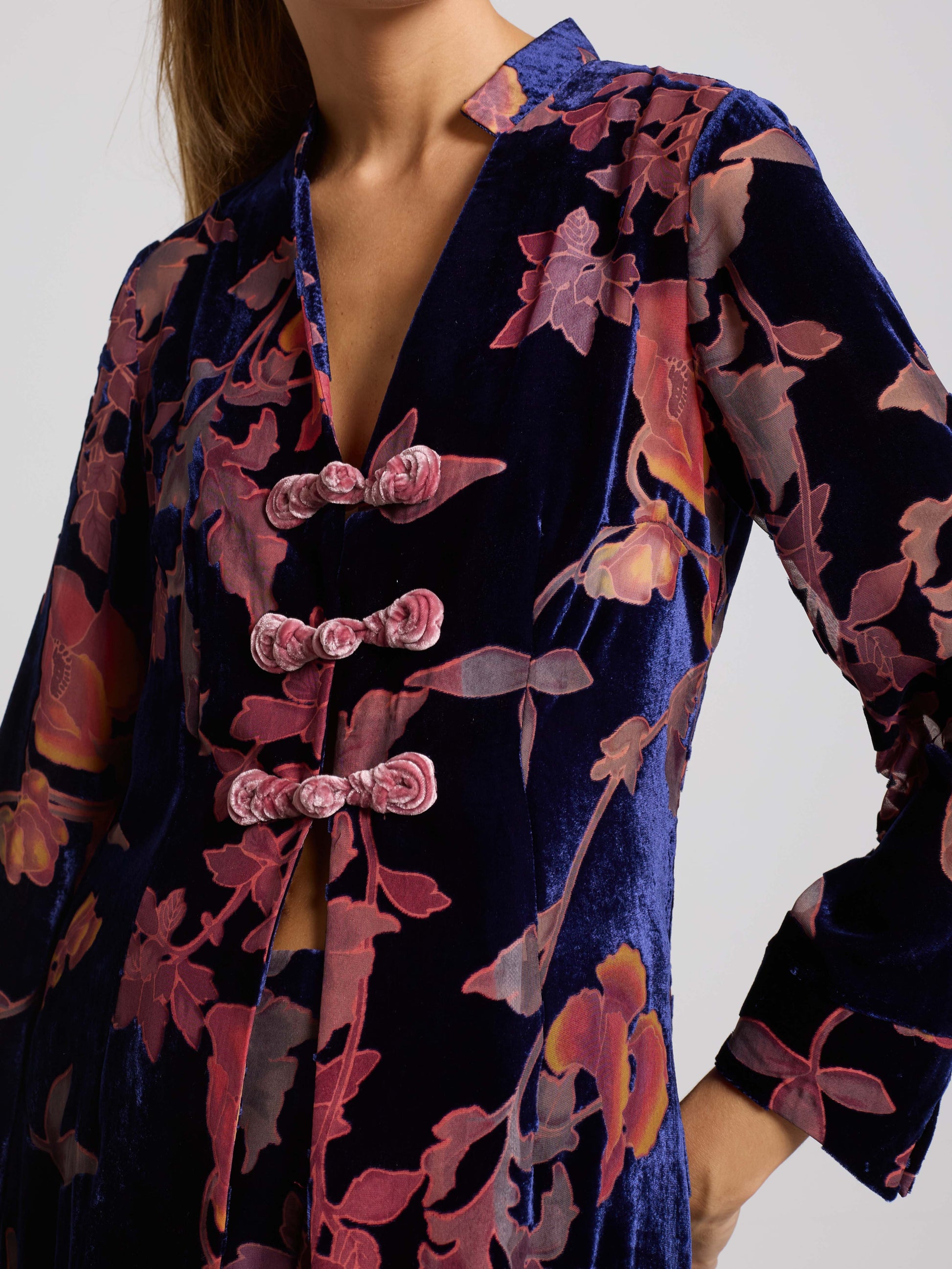 Levita ligera, con aperturas laterales pronunciadas y botonadura oriental.