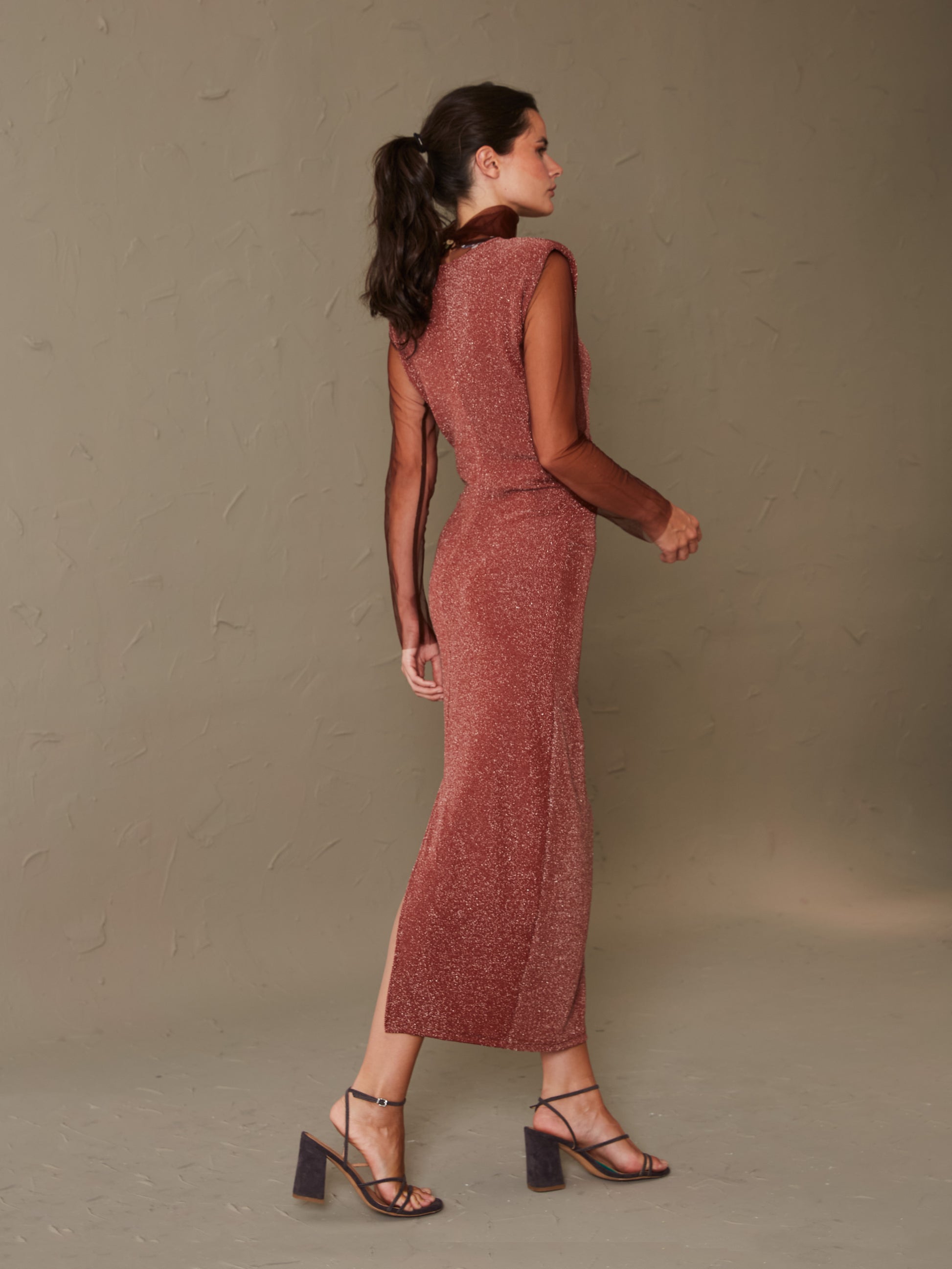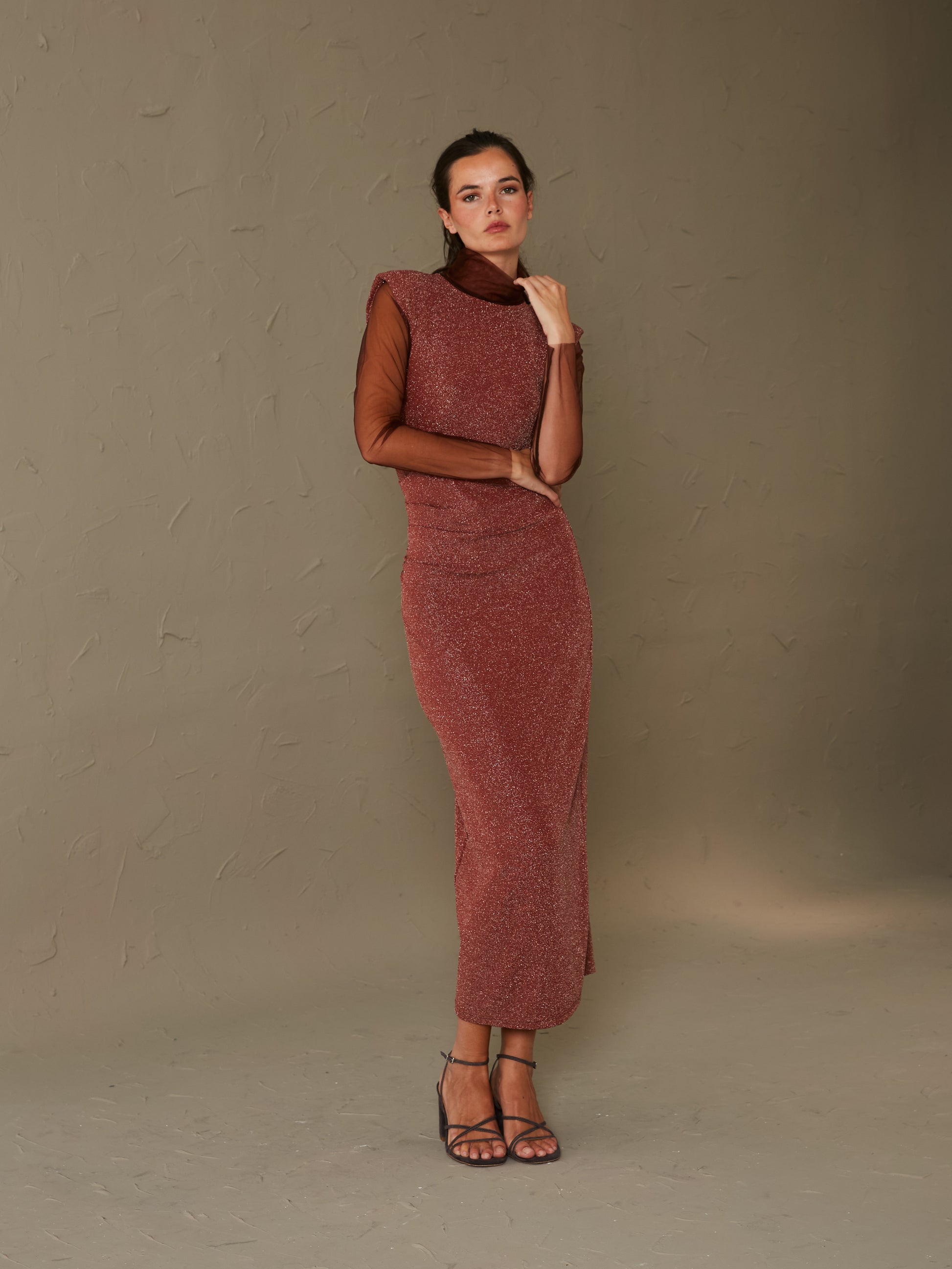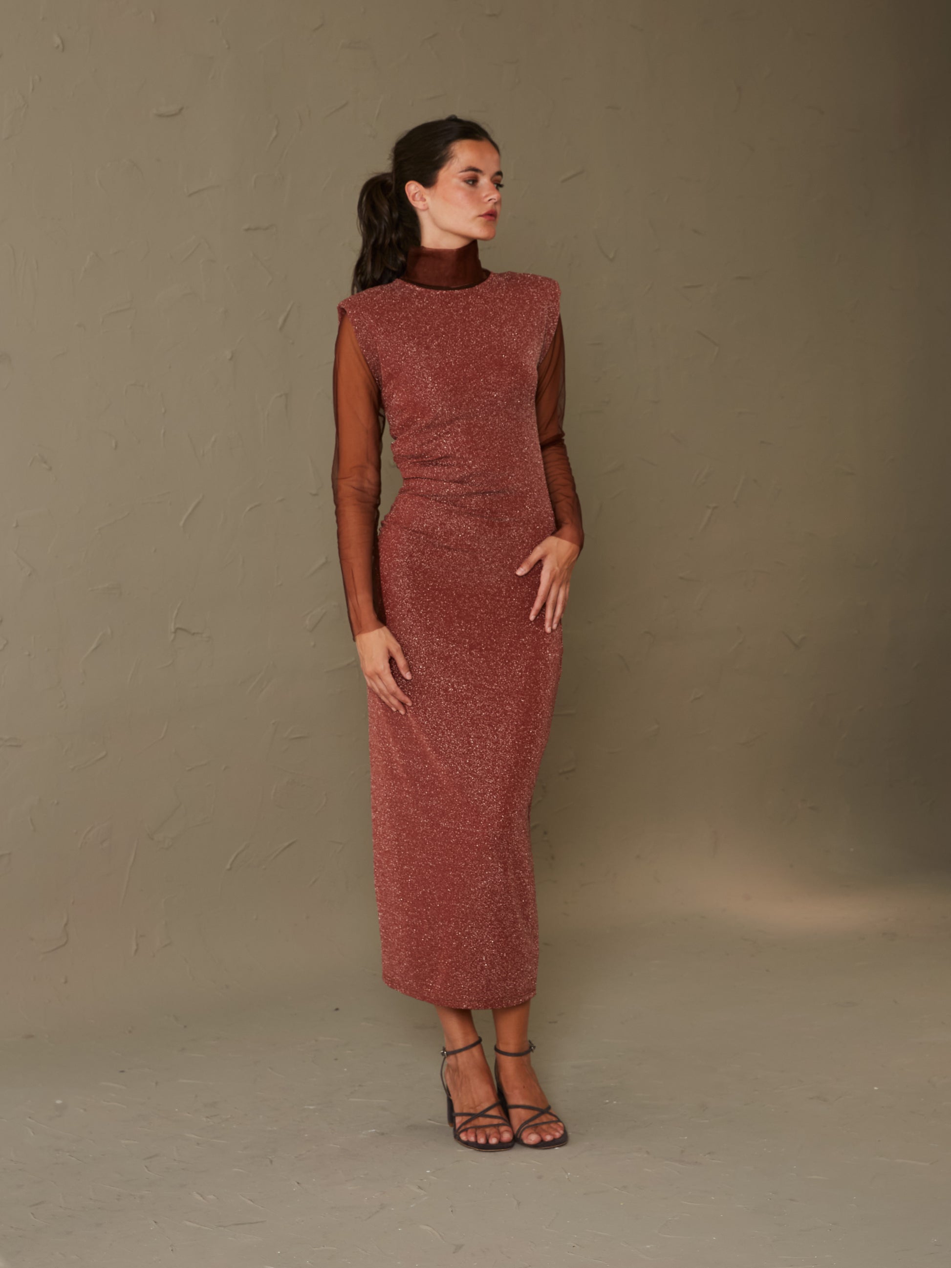 Dos piezas: top cuello alto en tul transparente y vestido sin mangas con cuello caja, entallado y largo midi. Vestido de tejido elástico que se adapta muy bien.