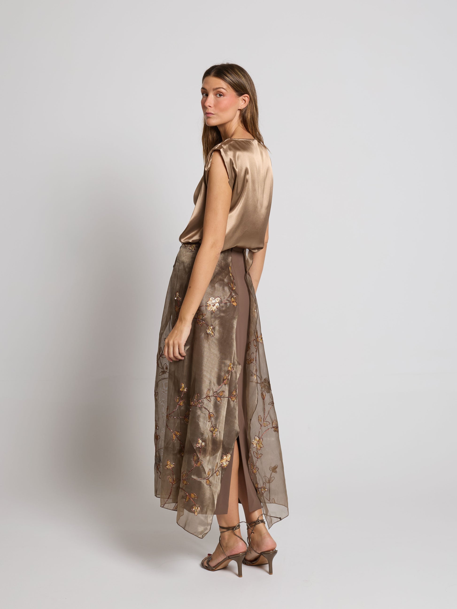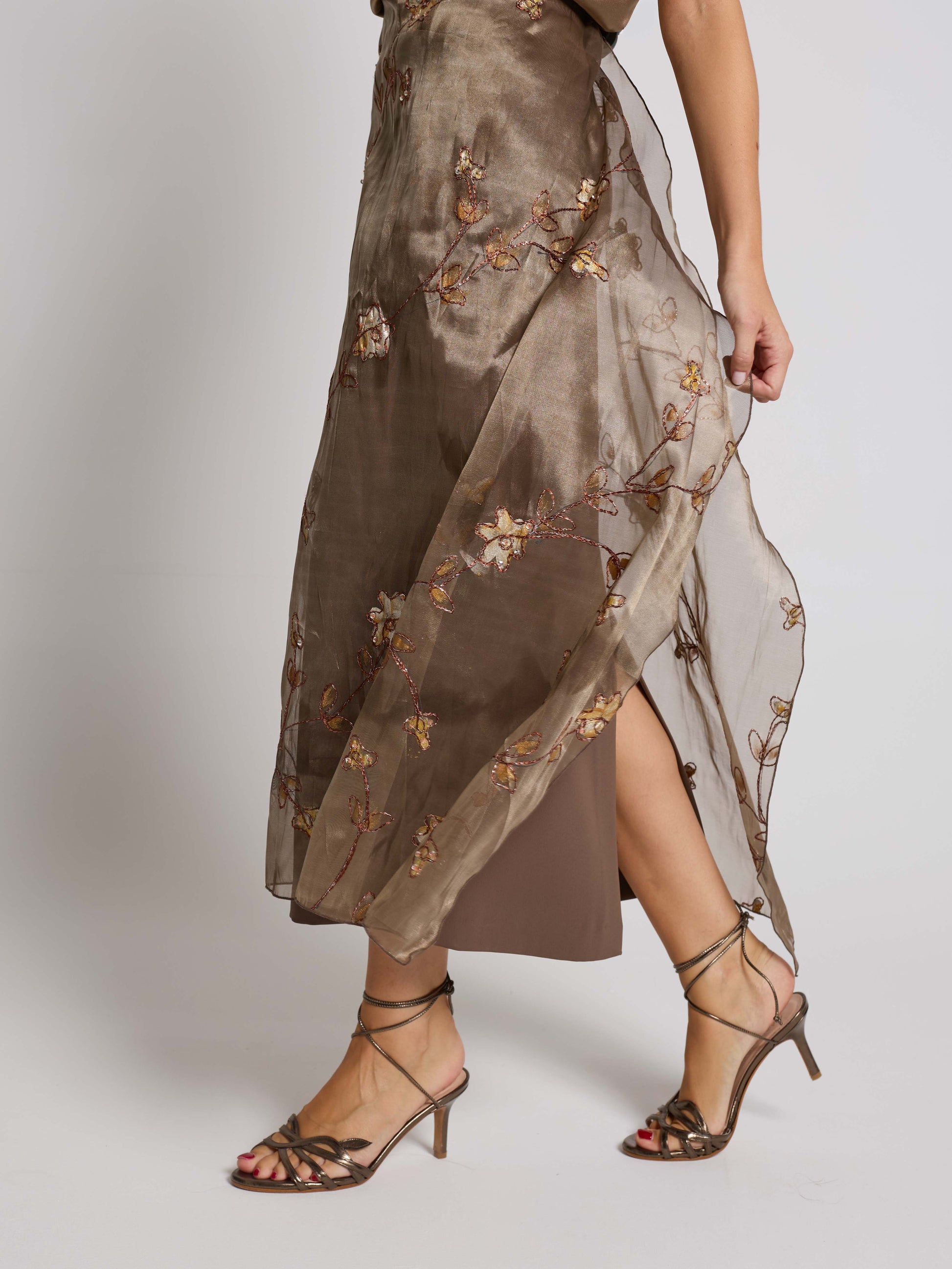 Falda doble capa de quita y pon, con clips en cintura. Falda interior tubo en crepe grueso elástico, con apertura trasera. Capa superior en chifón crepé ligero, con aplicaciones bordadas, y transparente.