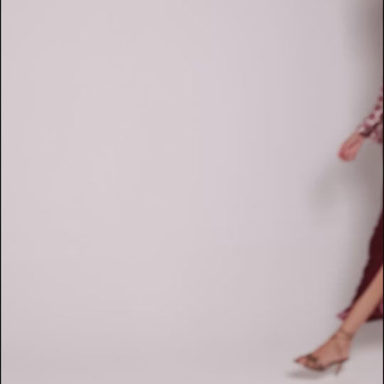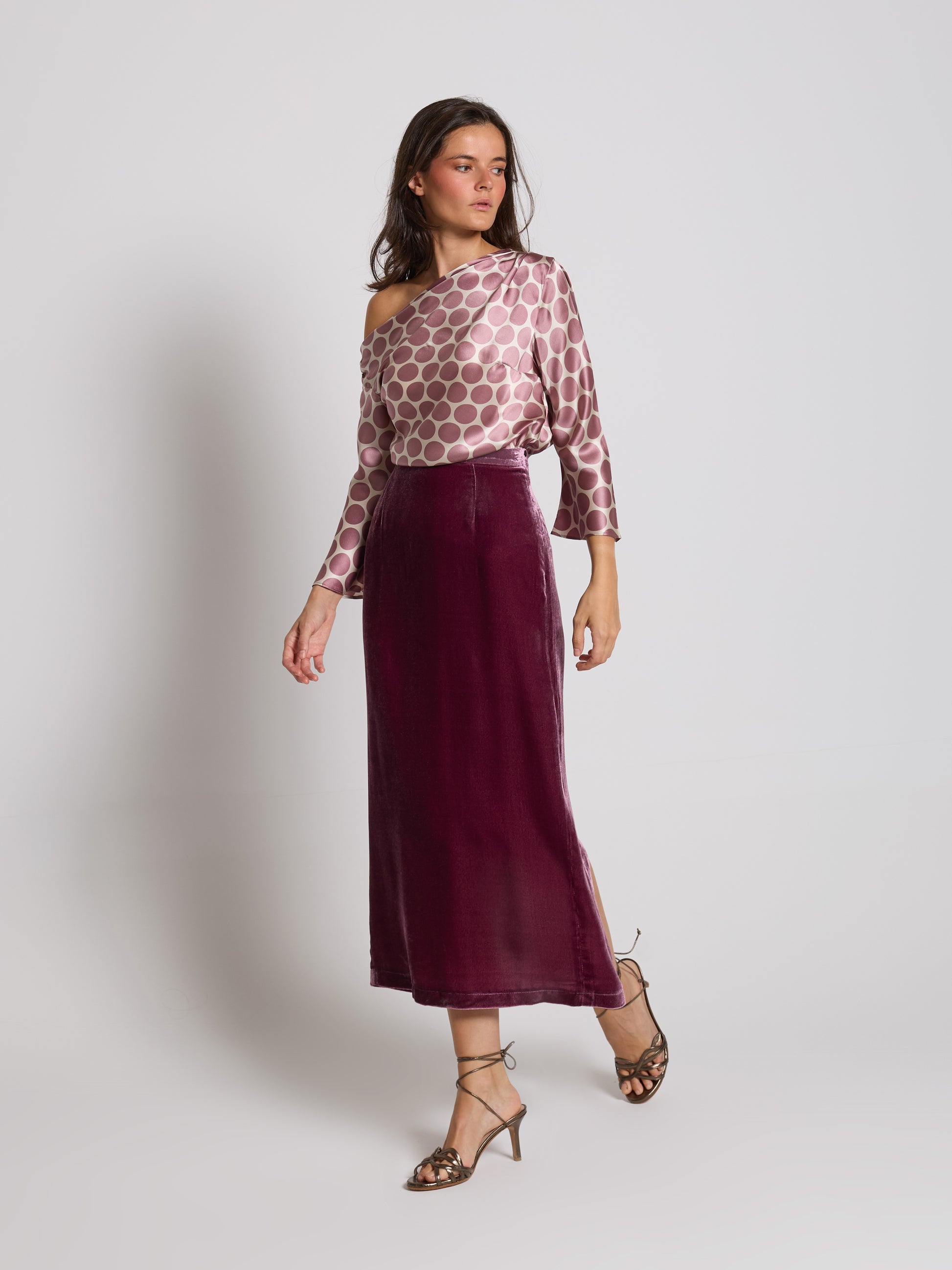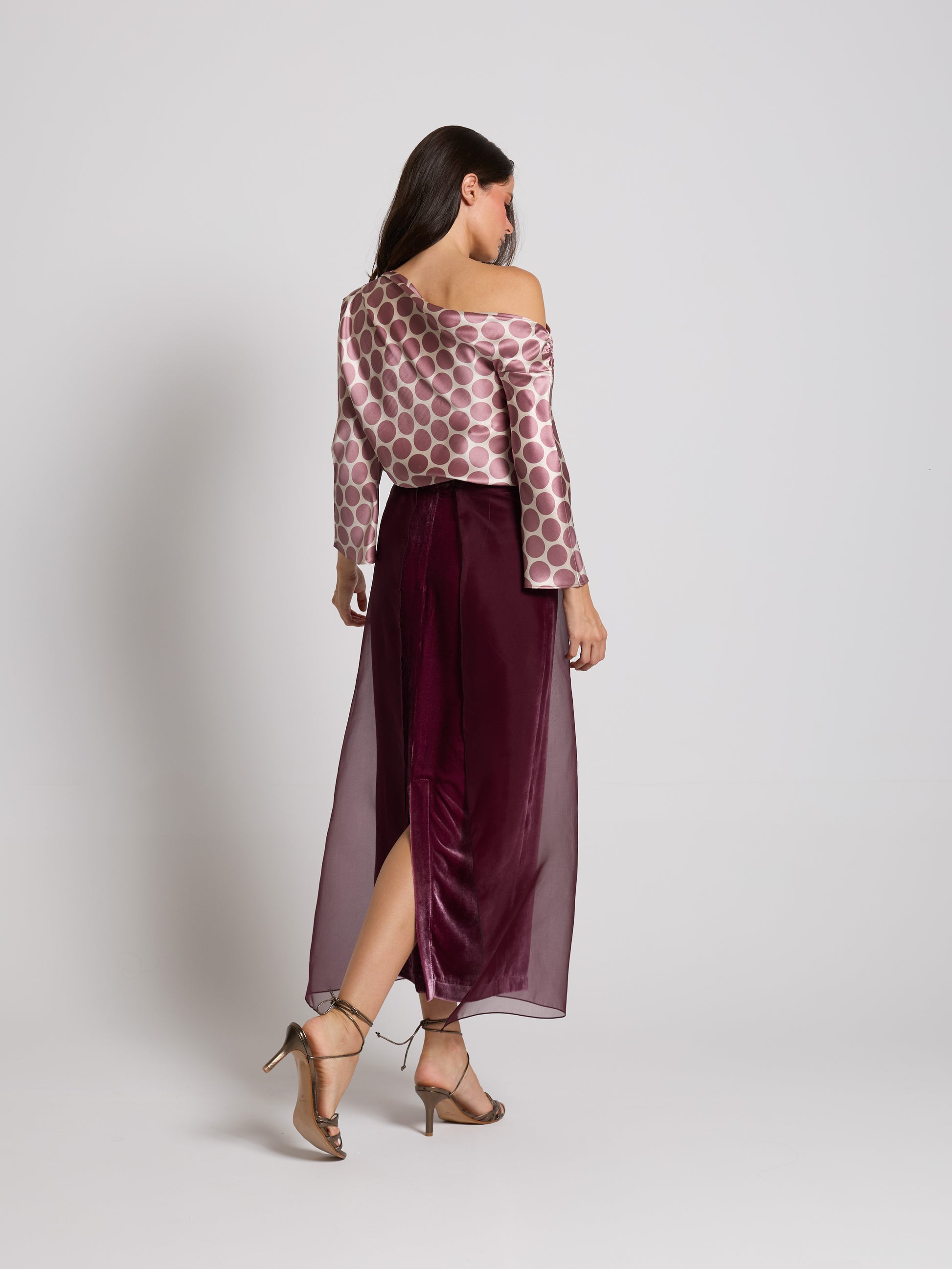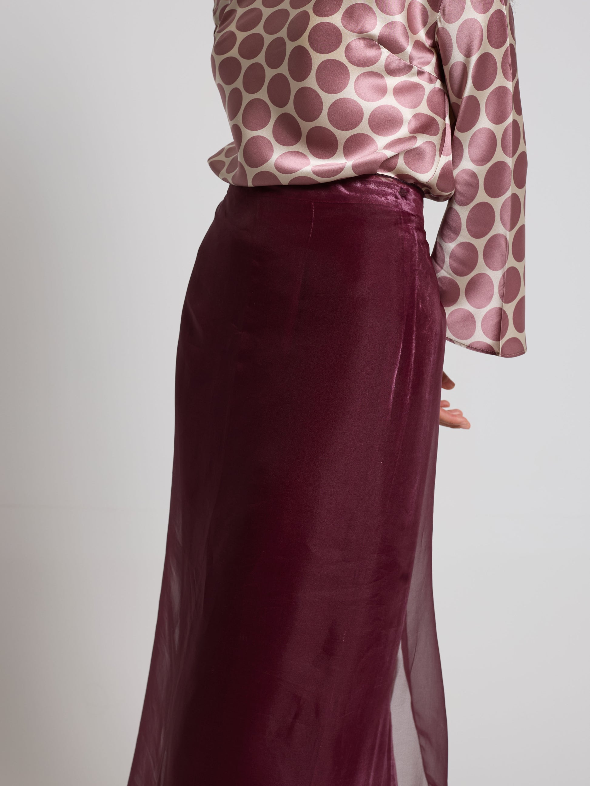 Falda doble capa de quita y pon, con clips en cintura. Falda interior tubo en terciopelo de seda con apertura trasera, con forro. Capa superior en chifón crepé ligero y transparente.