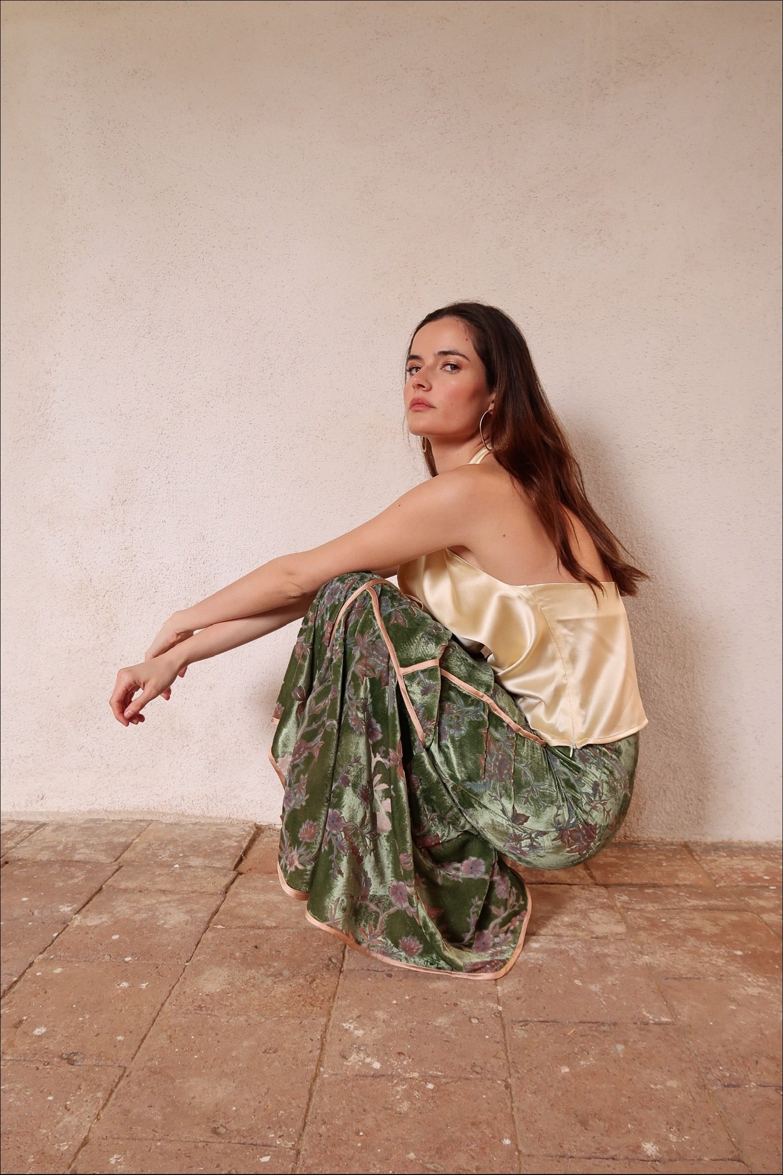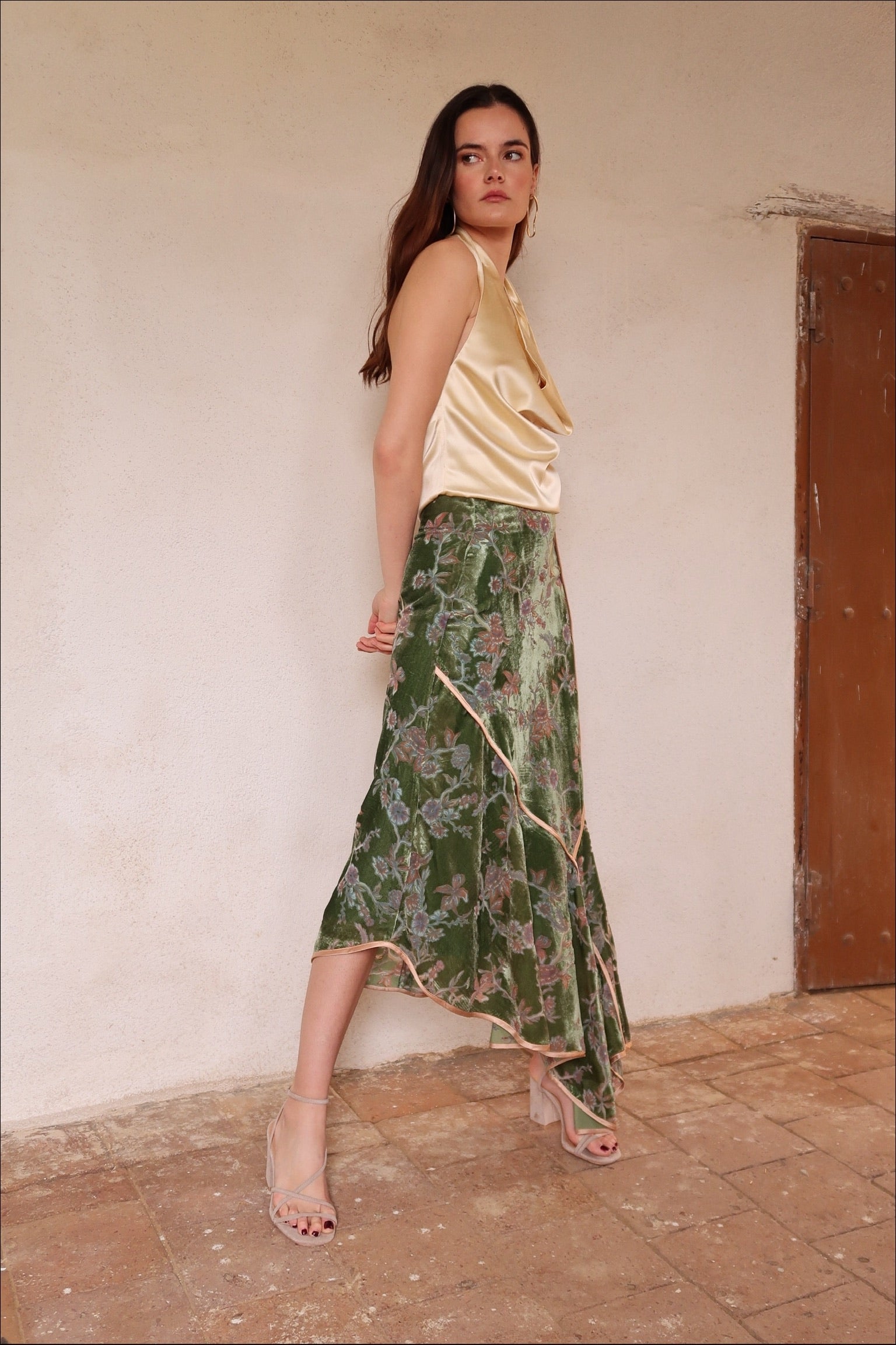 Falda de terciopelo de seda labrado, asimétrica y con volante amplio.
