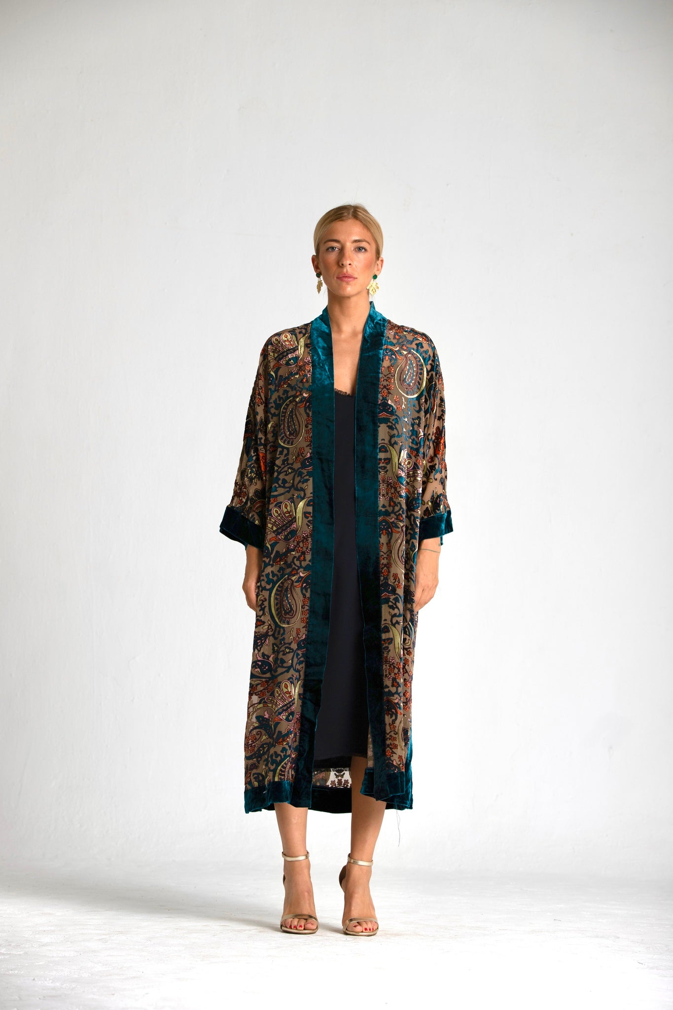 Kimono de terciopelo labrado de seda con detalles florales. Largo 120 cm.
