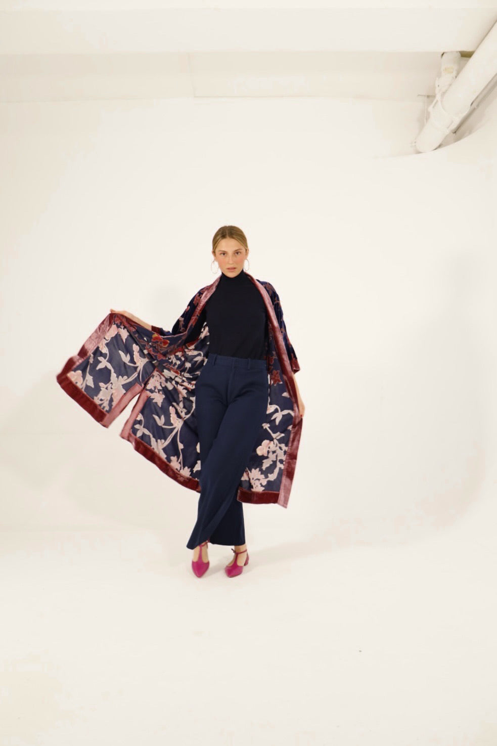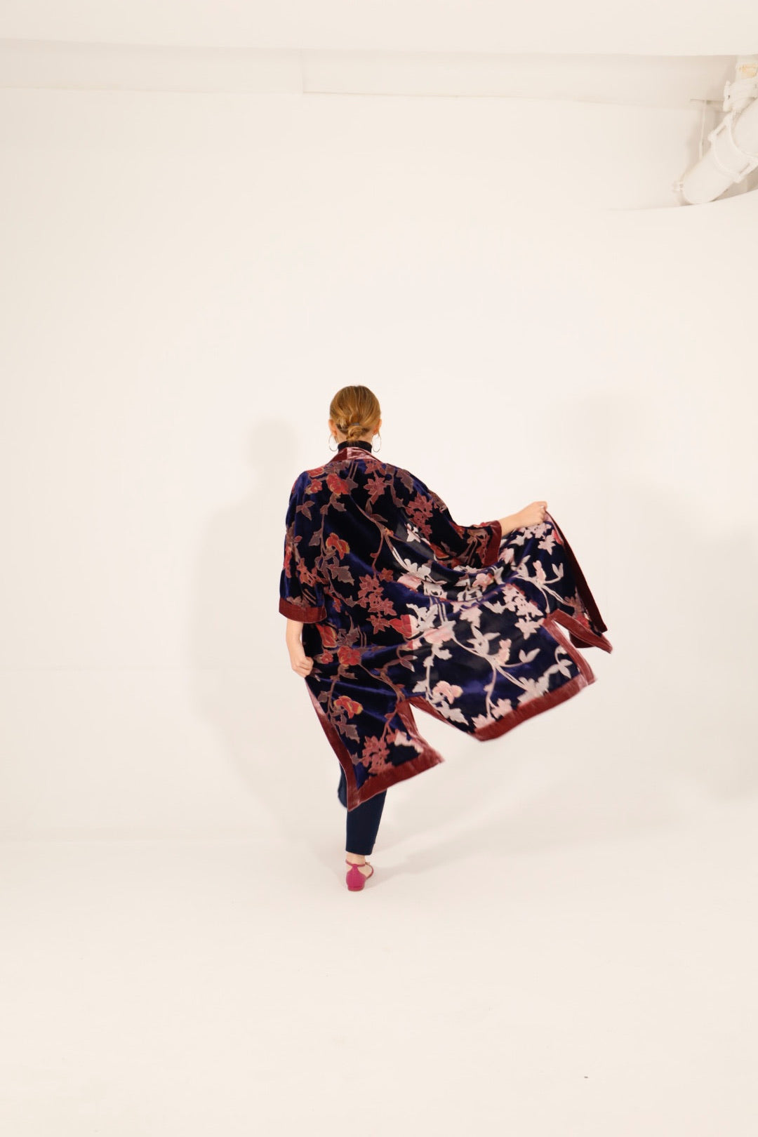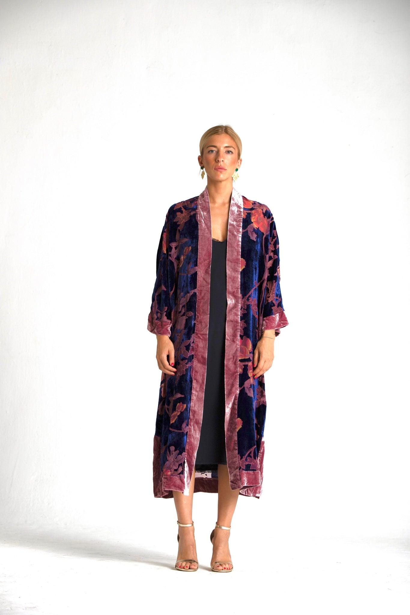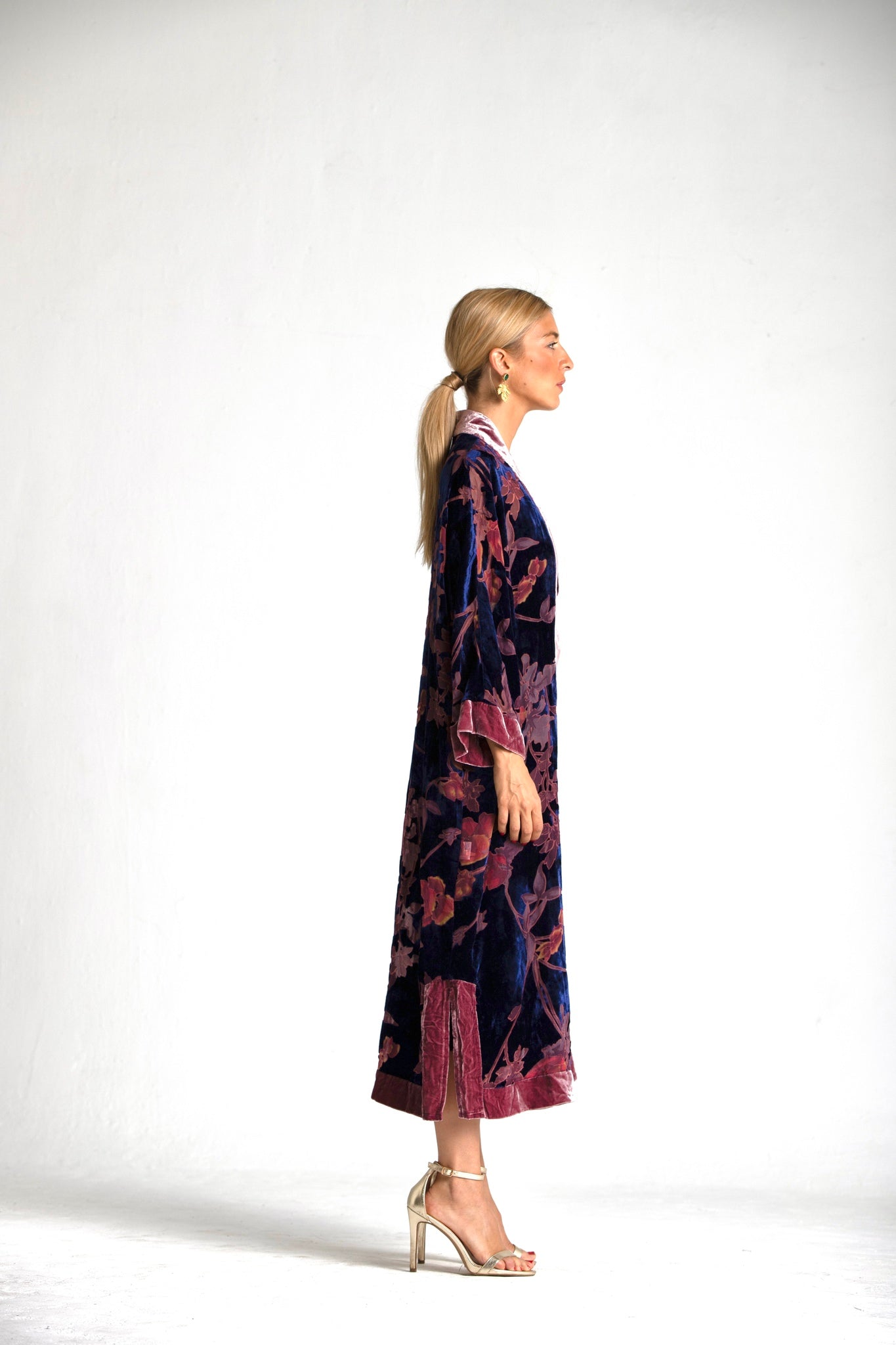 Kimono de terciopelo de seda labrado con estampado de flores azul y rosa. Largo 120 cm.