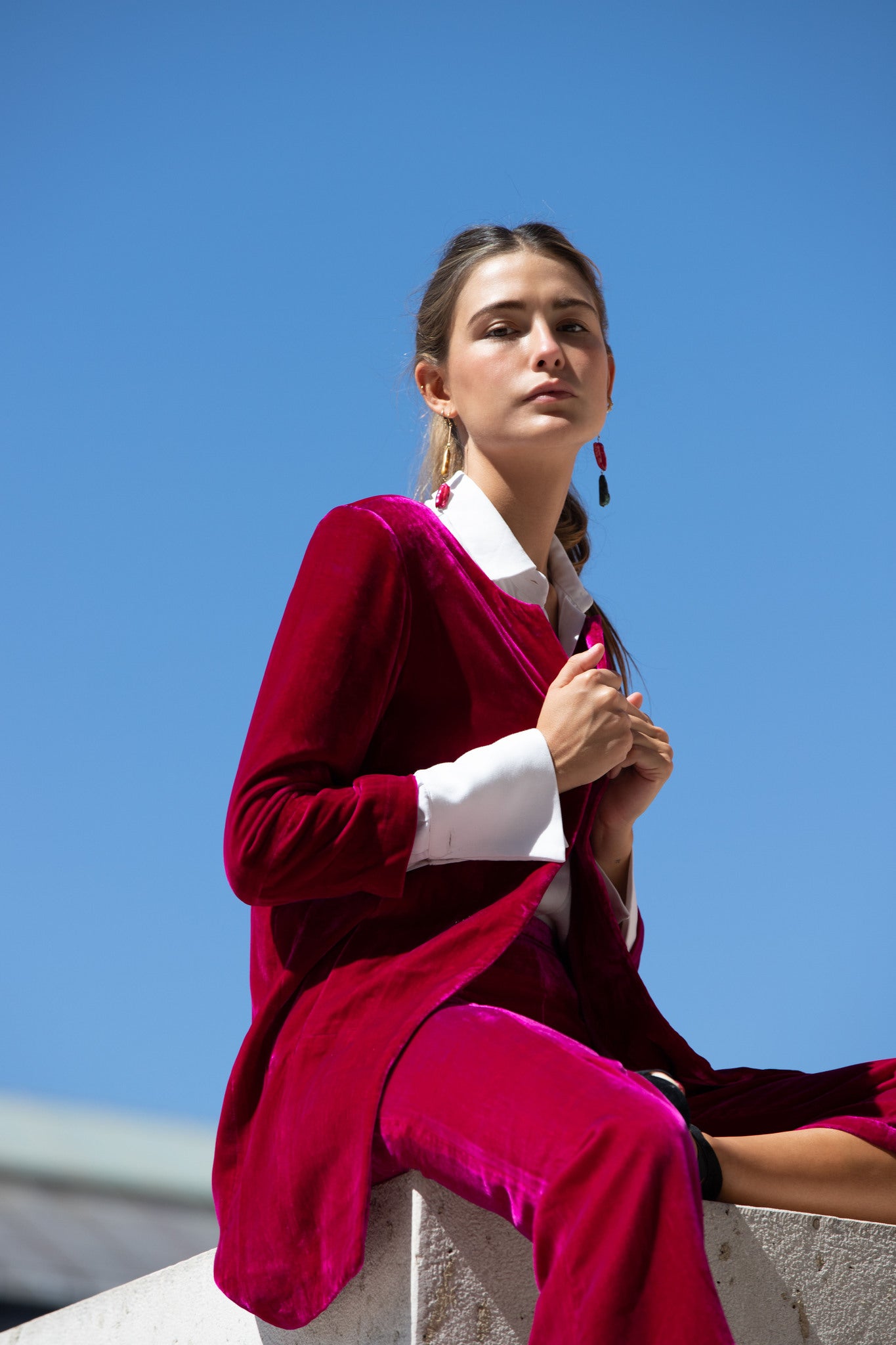 Levita color fucsia, de corte medio y recto. De terciopelo de seda y con bolsillos laterales.