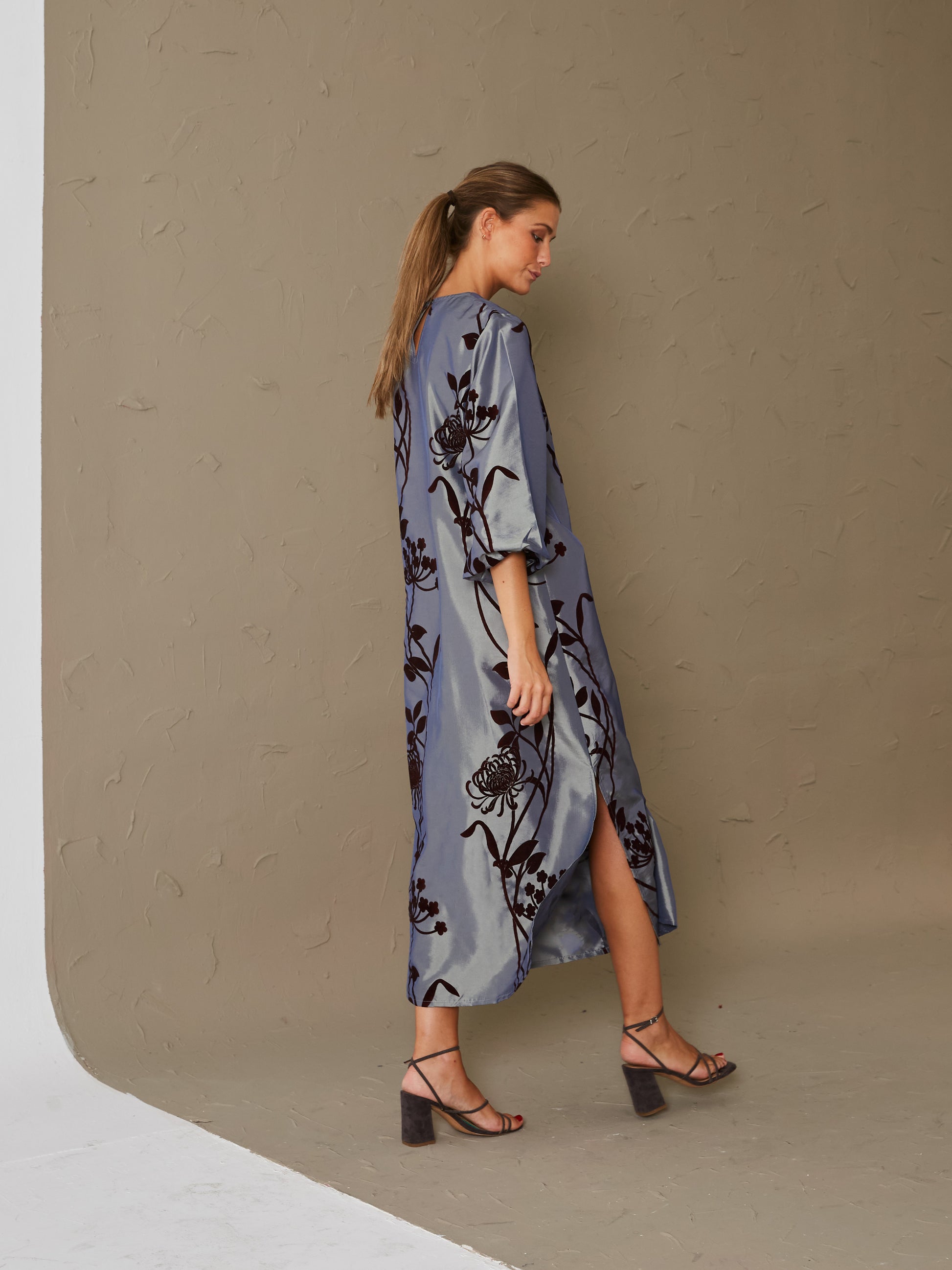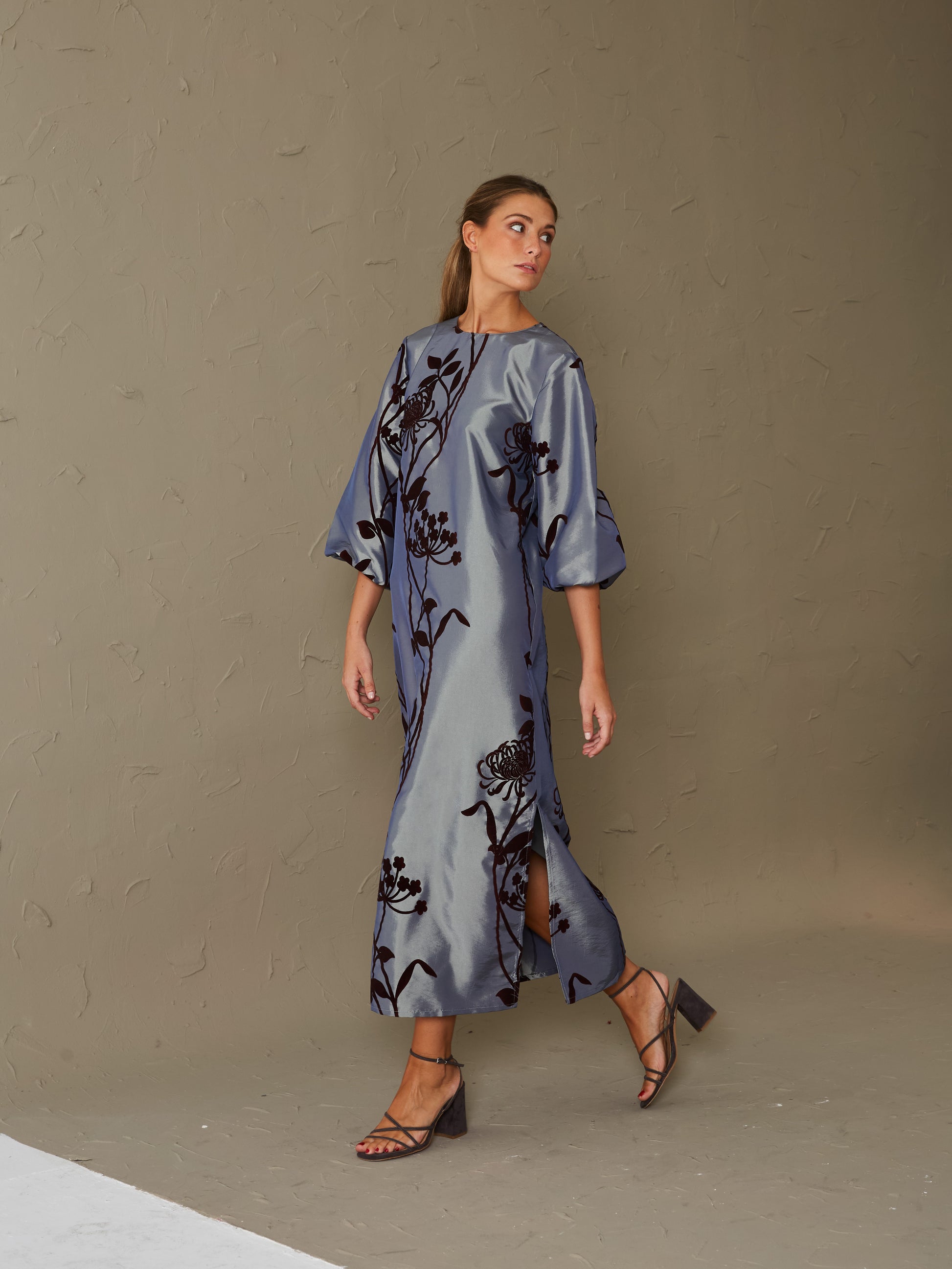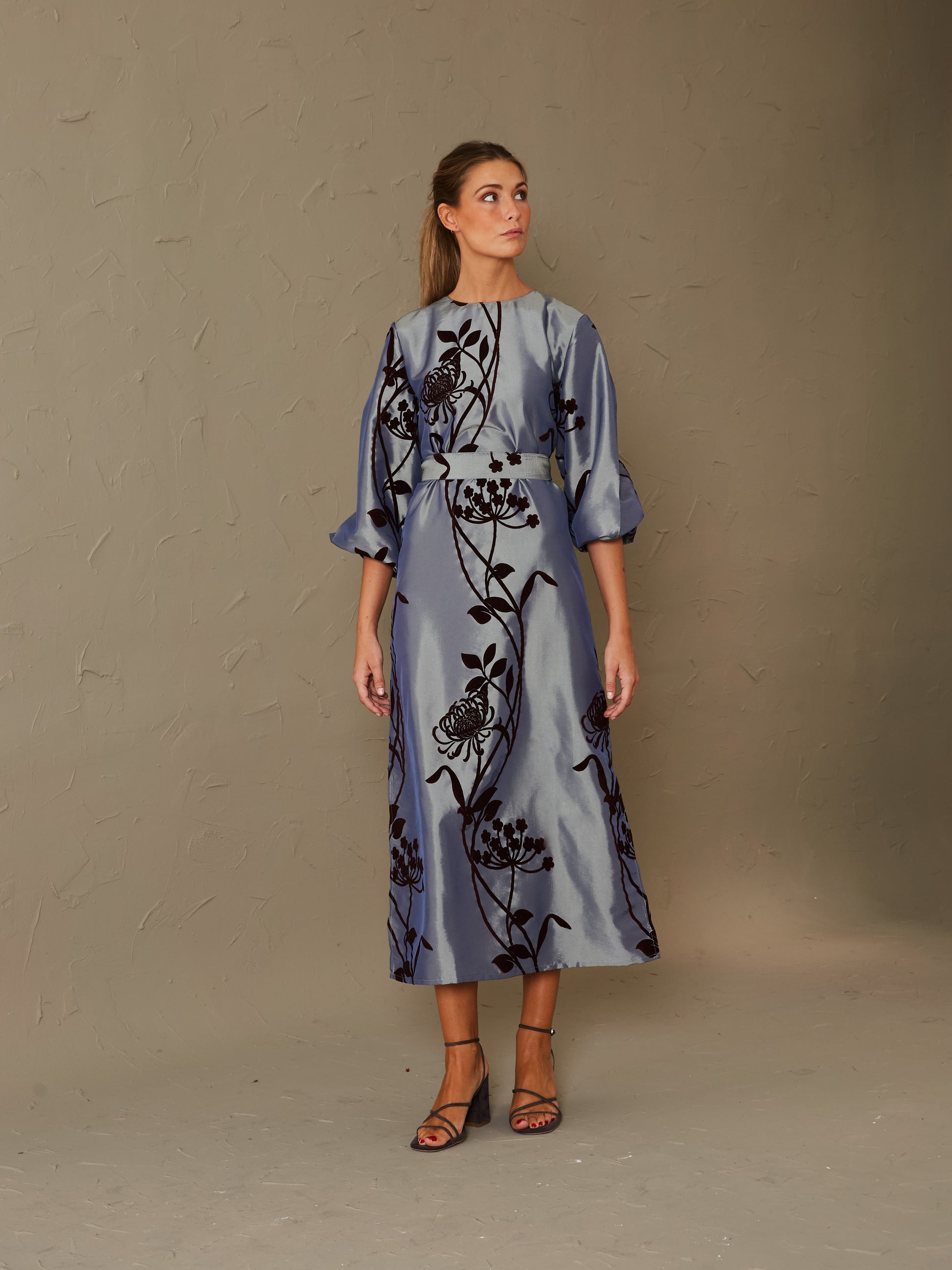 Vestido largo midi, con cuello caja, mangas encajadas abullonadas y cinturón. Muy versátil, se puede poner con y sin cinturón. Estampado en relieve.